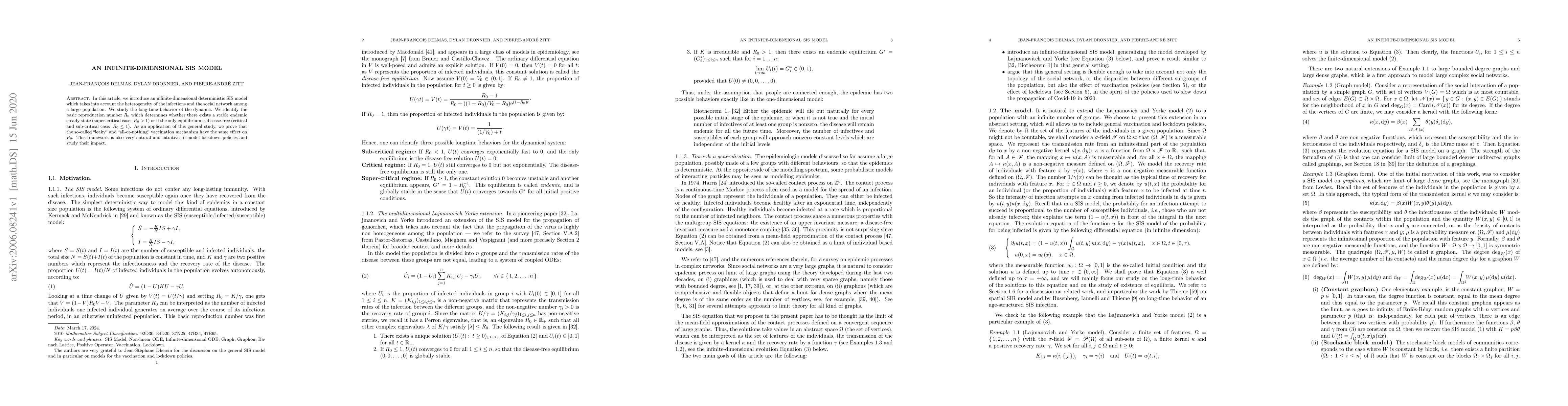 In this article, we introduce an infinite-dimensional deterministic SIS model which takes into account the heterogeneity of the infections and the social network among a large population. We study the long-time behavior of the dynamic. We identify the basic reproduction number $R_0$ which determines whether there exists a stable endemic steady state (super-critical case: $R_0>1$) or if the only equilibrium is disease-free (critical and sub-critical case: $R_0\leq1$). As an application of this general study, we prove that the so-called ``leaky'' and ``all-or-nothing'' vaccination mechanism have the same effect on $R_0$. This framework is also very natural and intuitive to model lockdown policies and study their impact.