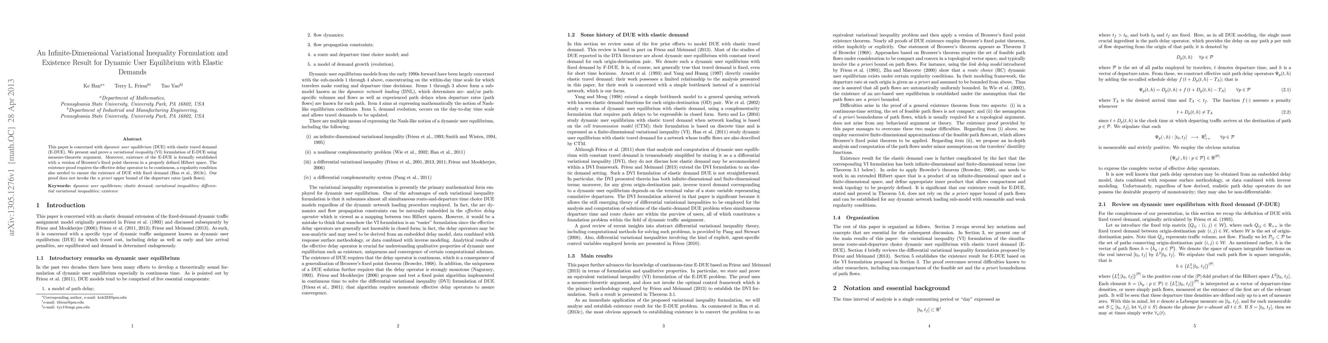 This paper is concerned with dynamic user equilibrium (DUE) with elastic travel demand (E-DUE). We present and prove a variational inequality (VI) formulation of E-DUE using measure-theoretic argument. Moreover, existence of the E-DUE is formally established with a version of Brouwer's fixed point theorem in a properly defined Hilbert space. The existence proof requires the effective delay operator to be continuous, a regularity condition also needed to ensure the existence of DUE with fixed demand (Han et al., 2013c). Our proof does not invoke the a priori upper bound of the departure rates (path flows).