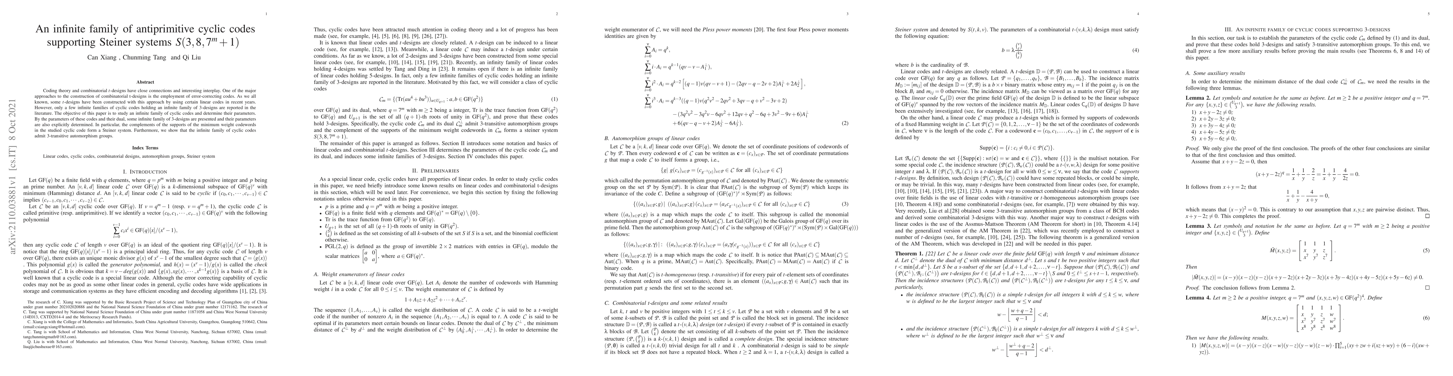 This paper explores an infinite family of antiprimitive cyclic codes that support Steiner systems $S(3,8, 7^m+1)$. The authors determine the parameters of these codes and their duals, revealing an infinite family of $3$-designs with specific parameters, and demonstrate that the codes have $3$-transitive automorphism groups.