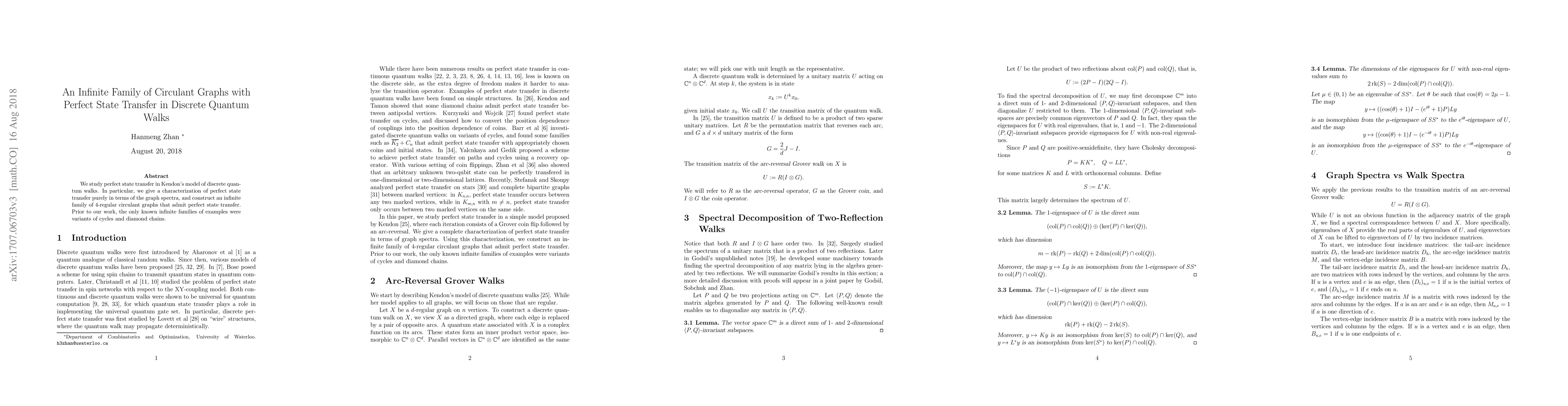 This paper characterizes perfect state transfer in Kendon's model of discrete quantum walks using graph spectra and constructs an infinite family of $4$-regular circulant graphs that achieve this, expanding beyond previously known examples like cycles and diamond chains.