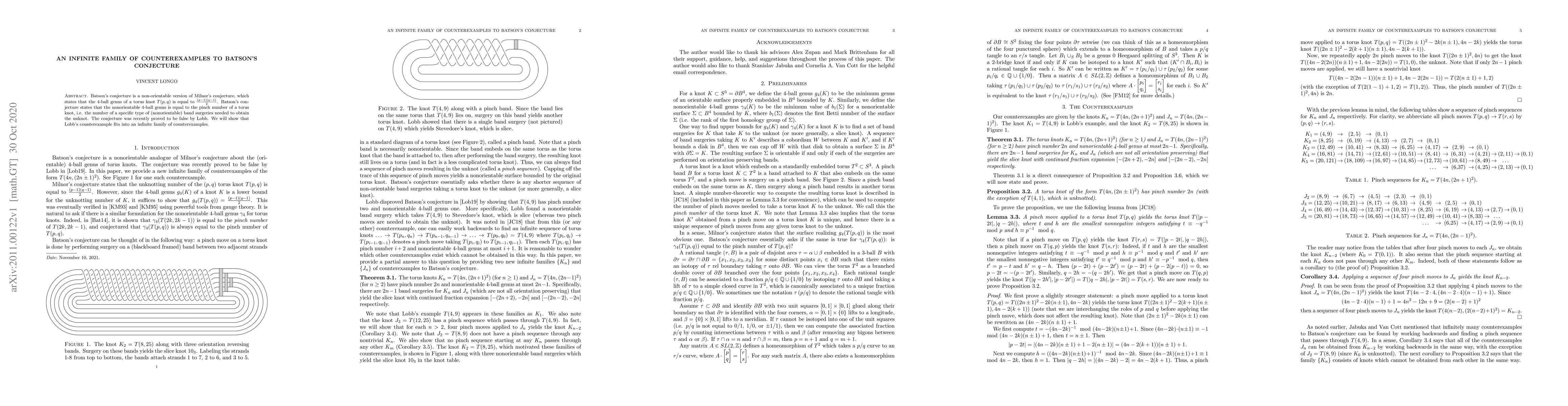 The paper presents an infinite family of counterexamples to Batson's conjecture by analyzing torus knots T(4n,(2n+1)2) and T(4n,(2n-1)2) for n ≥ 1 and n ≥ 2, respectively, using pinch moves and Heegaard splittings.