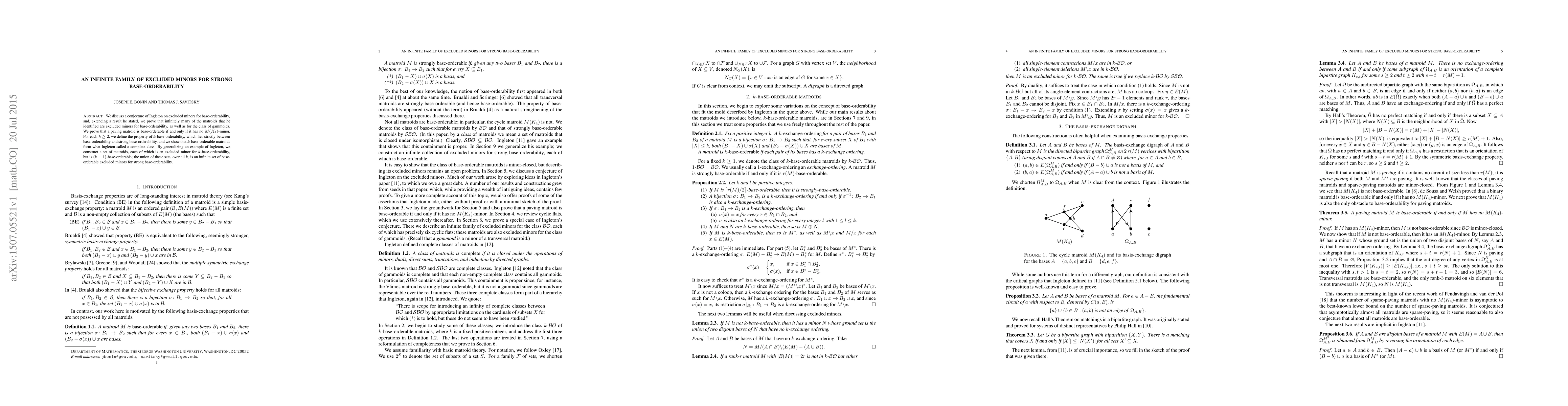 This paper proves that an infinite family of matroids identified by Ingleton serves as excluded minors for both base-orderability and gammoids. It establishes that a paving matroid is base-orderable if it lacks a minor isomorphic to the cycle matroid of a complete graph on four vertices.