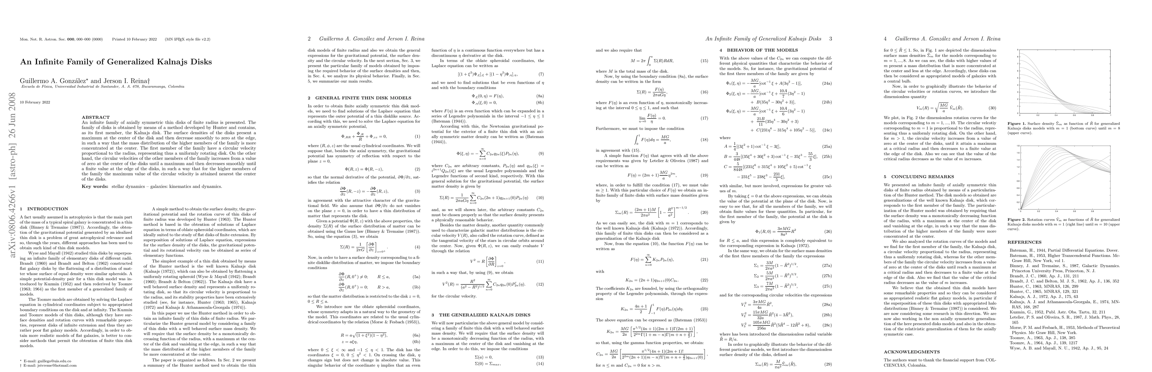 This paper introduces an infinite family of generalized Kalnajs disks characterized by axially symmetric, thin-disk structures with finite radii. The disks exhibit a surface density peaking at the center and decreasing to zero at the edge, with higher members having more concentrated mass distributions. The first member has a circular velocity proportional to the radius, while subsequent members show increasing circular velocity from the center to a maximum near the center before decreasing to a finite edge value.