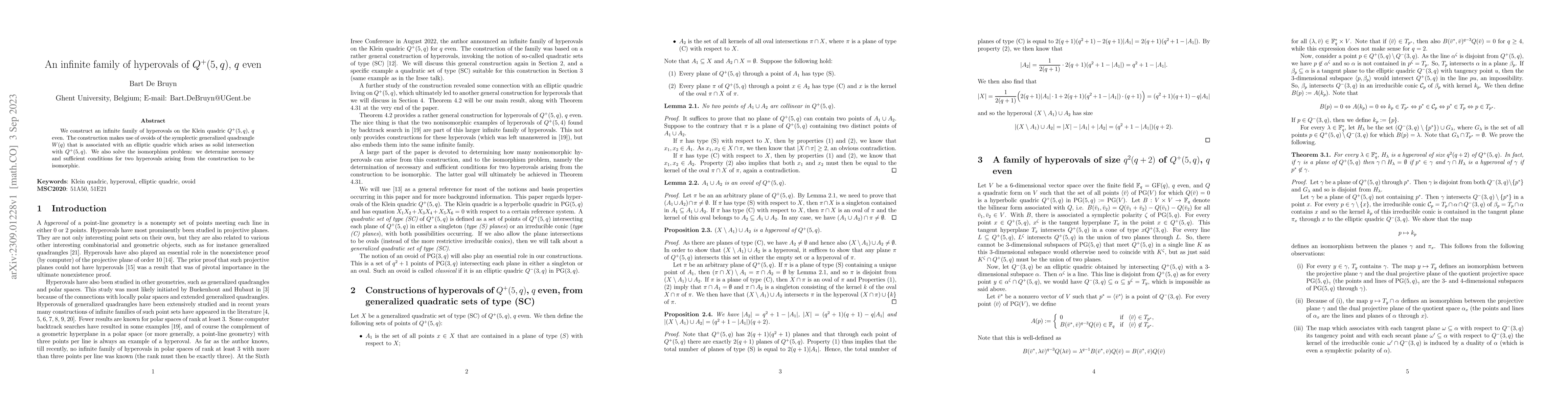 This paper constructs an infinite family of hyperovals on the Klein quadric $Q^+(5,q)$ for even $q$, using ovoids from the associated symplectic generalized quadrangle $W(q)$. It also provides necessary and sufficient conditions for the isomorphism of hyperovals from this construction.