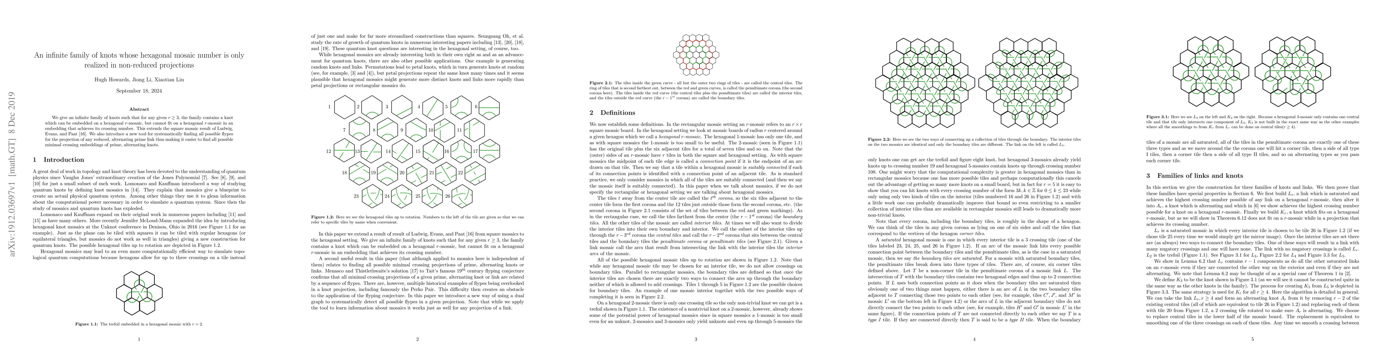 Summary: This paper presents an infinite family of knots that can be embedded on hexagonal mosaics but cannot do so while maintaining their crossing number in reduced projections, extending prior work on square mosaics. It also introduces a new method for identifying all potential flypes in reduced, alternating prime link projections.