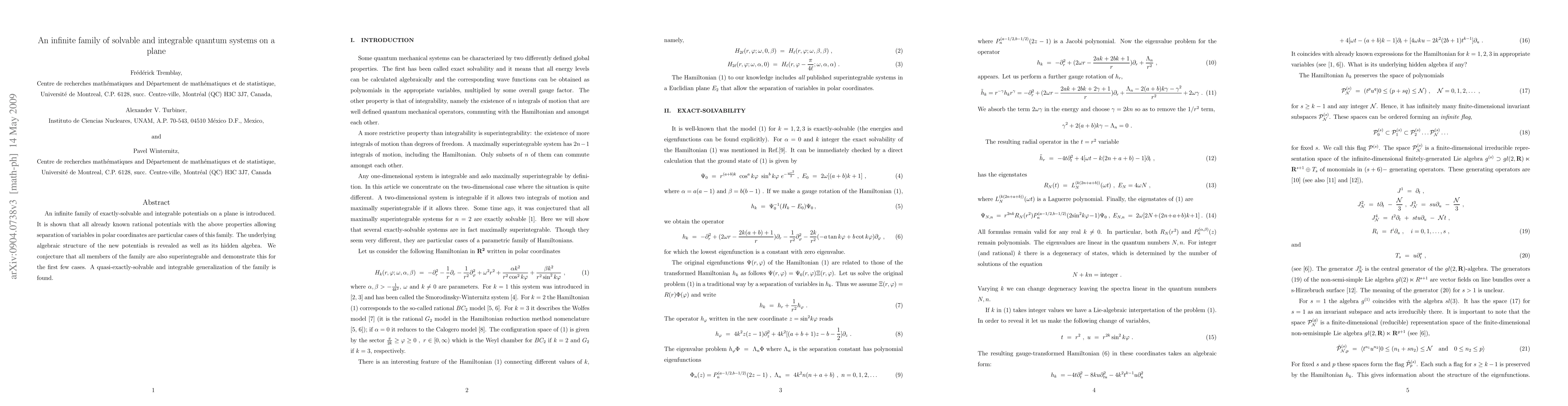 This paper introduces an infinite family of solvable and integrable quantum systems on a plane, showing that known rational potentials are special cases within this family. The underlying algebraic structure and hidden algebra are revealed, and the authors conjecture that all members are superintegrable, supported by initial cases.