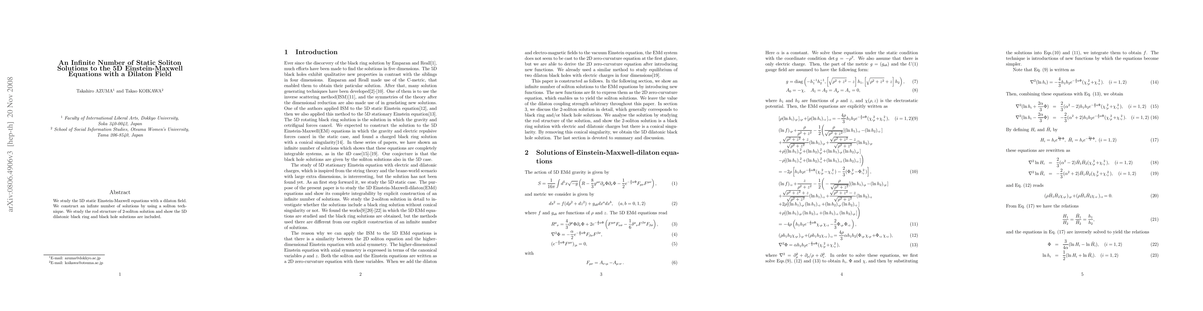 This paper constructs an infinite number of static soliton solutions to the 5D Einstein-Maxwell equations with a dilaton field using soliton techniques. It specifically examines the rod structure of 2-soliton solutions, demonstrating the inclusion of 5D dilatonic black ring and black hole solutions.