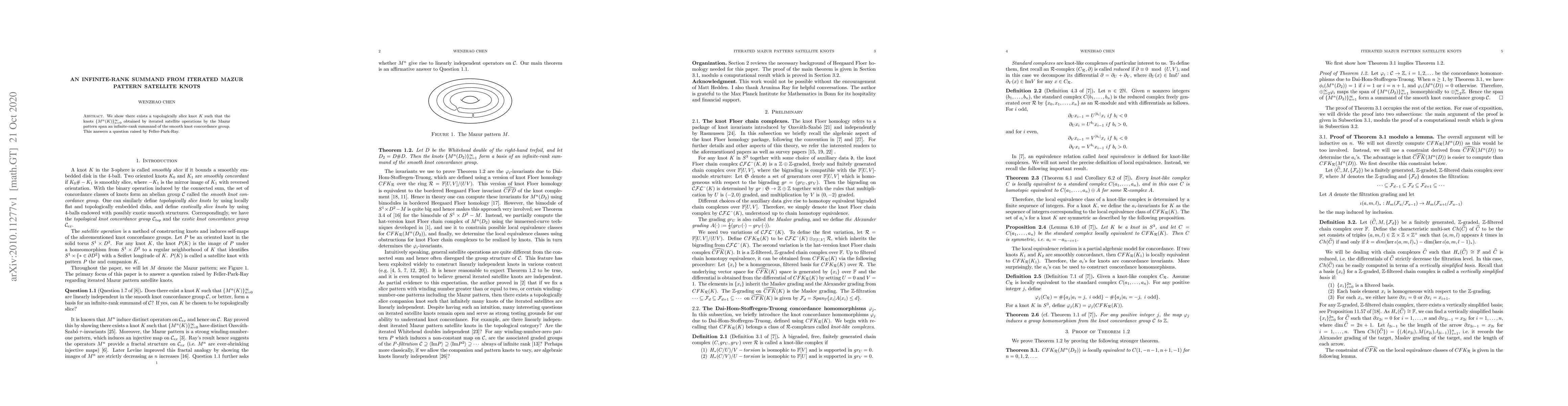 This paper demonstrates the existence of a topologically slice knot $K$ whose iterated satellite knots, formed using the Mazur pattern, create an infinite-rank summand in the smooth knot concordance group, solving a question posed by Feller-Park-Ray.
