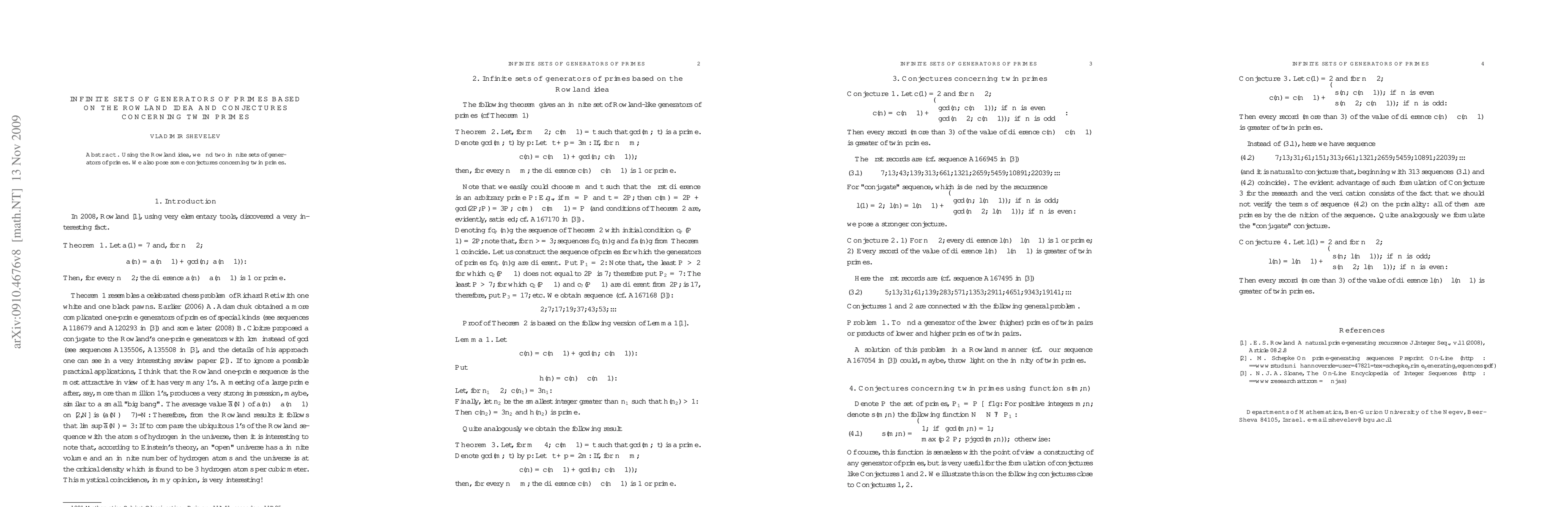 Summary: This paper utilizes the Rowland idea to identify two infinite sets of prime number generators and introduces conjectures regarding twin primes. The findings contribute to the understanding of prime distribution and twin primes.