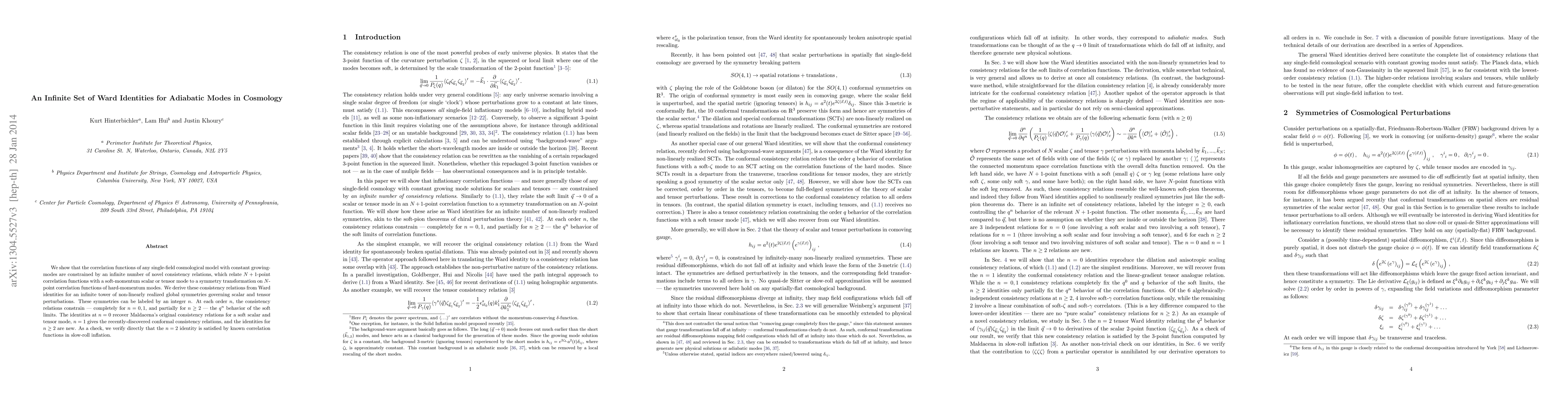 This paper introduces an infinite set of novel consistency relations for single-field cosmological models with constant growing-modes, derived from Ward identities for non-linearly realized symmetries. These relations constrain the correlation functions and reveal new insights into the behavior of soft modes in the context of scalar and tensor perturbations.
