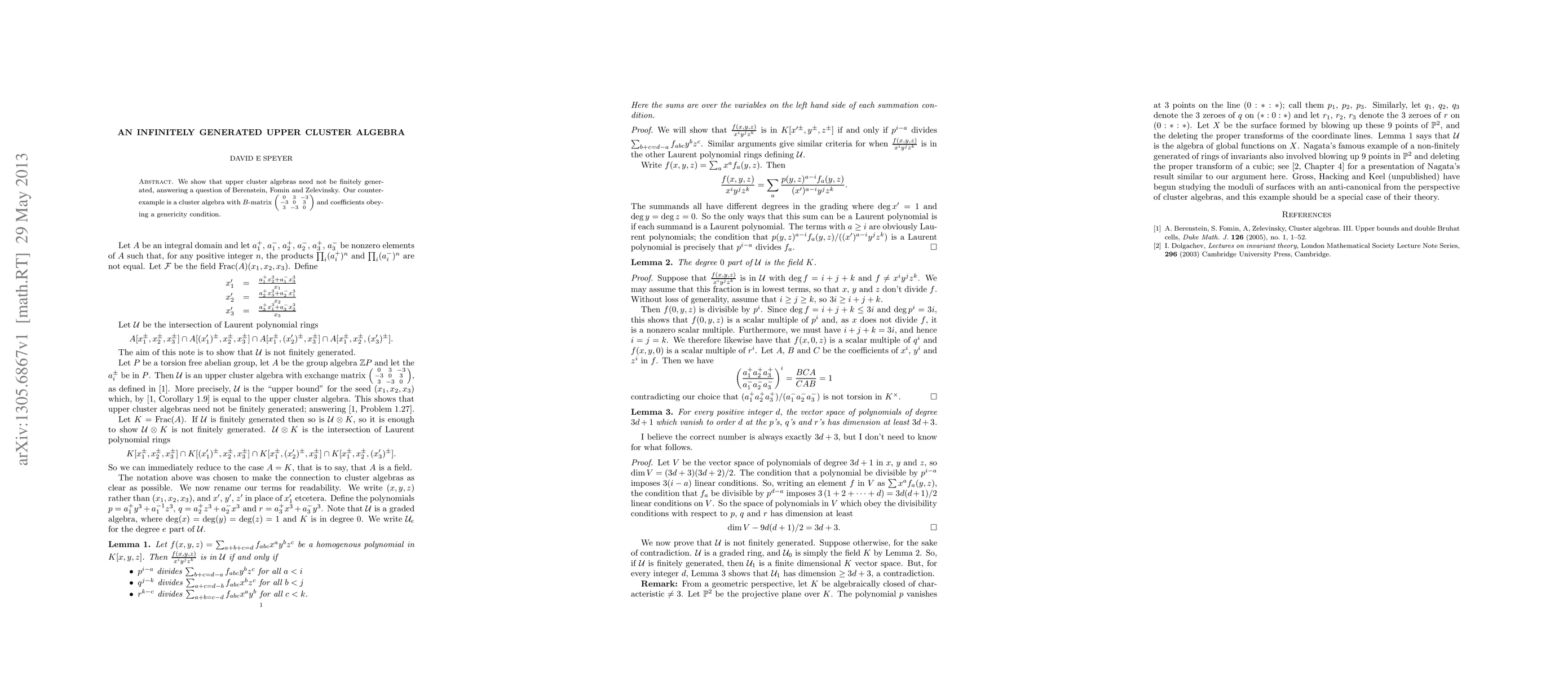A research paper shows that upper cluster algebras can be infinitely generated, contradicting a previous question about finitely generated algebras. It presents a specific counter-example with a unique B-matrix and coefficients.