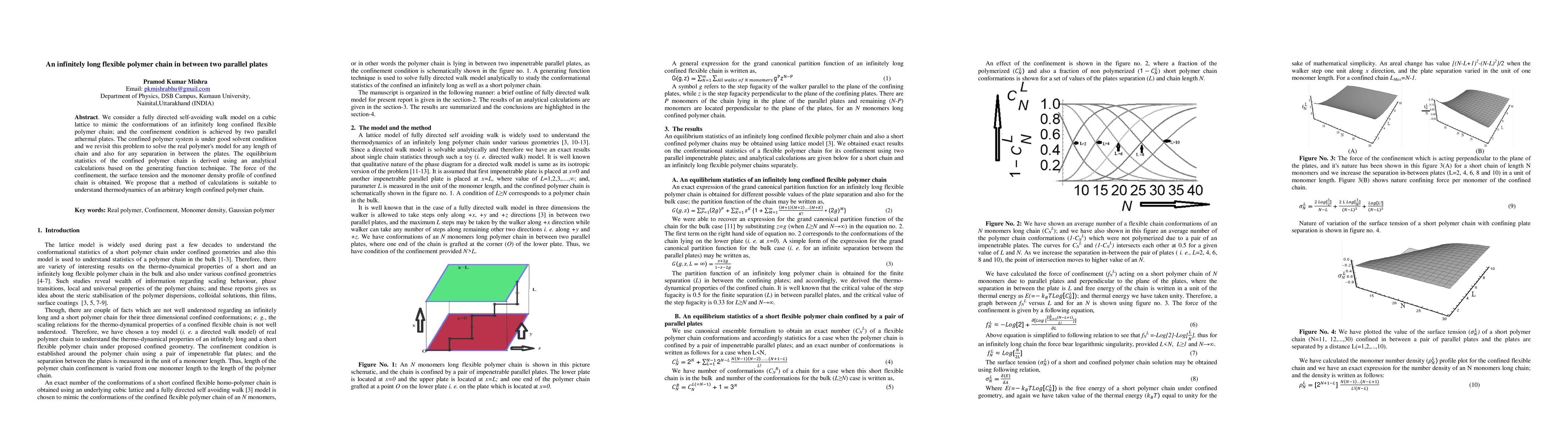 This paper models an infinitely long flexible polymer chain confined between two parallel plates using a self-avoiding walk on a cubic lattice under good solvent conditions. The study derives equilibrium statistics and calculates the confinement force, surface tension, and monomer density profile using analytical methods, proposing a suitable approach for understanding the thermodynamics of polymer chains of any length.