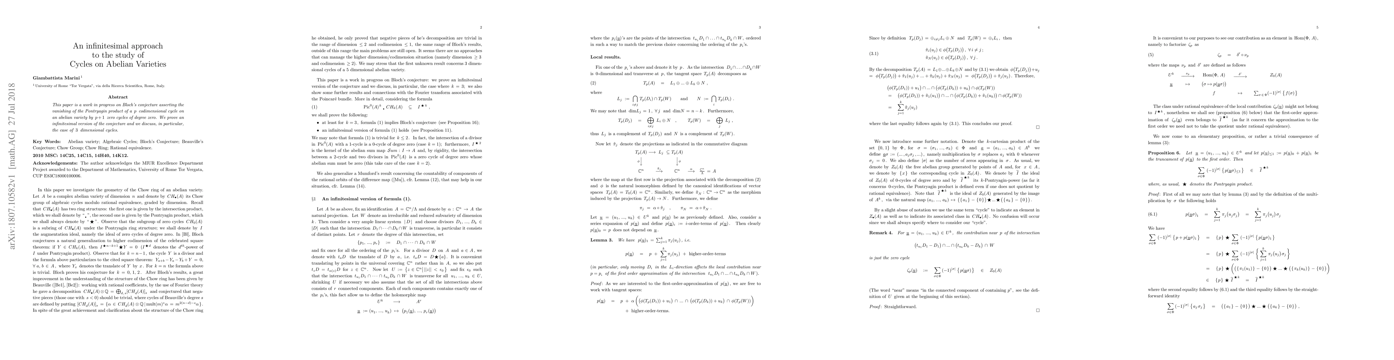 This paper is a work in progress on Bloch's conjecture asserting the vanishing of the Pontryagin product of a $ p $ codimensional cycle on an abelian variety by $ p+1 $ zero cycles of degree zero. We prove an infinitesimal version of the conjecture and we discuss, in particular, the case of $ 3 $ dimensional cycles.