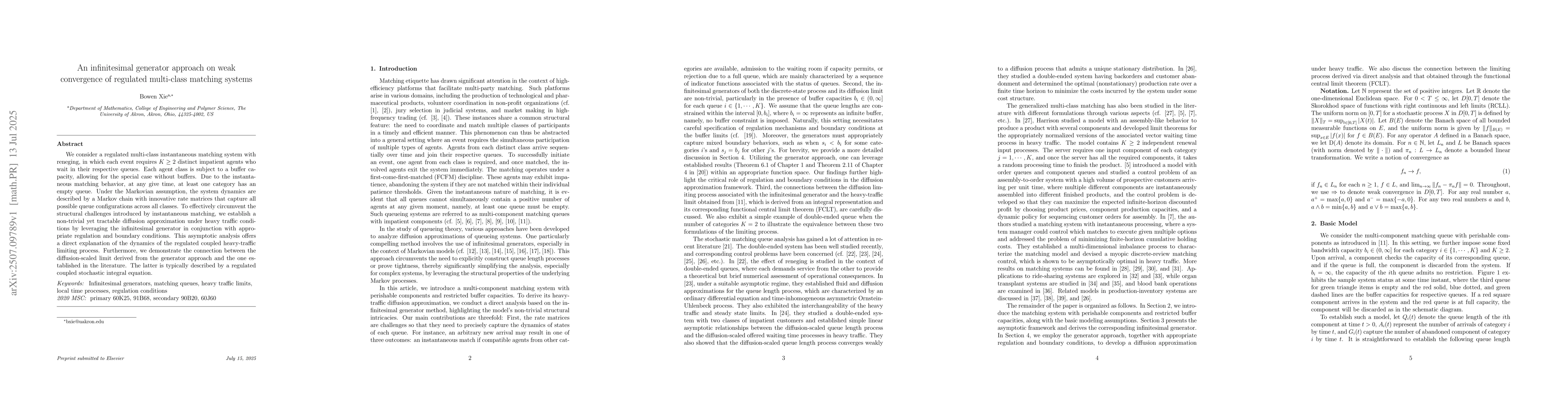 We consider a regulated multi-class instantaneous matching system with reneging, in which each event requires $K \geq 2$ distinct impatient agents who wait in their respective queues. Each agent class is subject to a buffer capacity, allowing for the special case without buffers. Due to the instantaneous matching behavior, at any give time, at least one category has an empty queue. Under the Markovian assumption, the system dynamics are described by a Markov chain with innovative rate matrices that capture all possible queue configurations across all classes. To effectively circumvent the structural challenges introduced by instantaneous matching, we establish a non-trivial yet tractable diffusion approximation under heavy traffic conditions by leveraging the infinitesimal generator in conjunction with appropriate regulation and boundary conditions. This asymptotic analysis offers a direct explanation of the dynamics of the regulated coupled heavy-traffic limiting process. Furthermore, we demonstrate the connection between the diffusion-scaled limit derived from the generator approach and the one established in the literature. The latter is typically described by a regulated coupled stochastic integral equation.