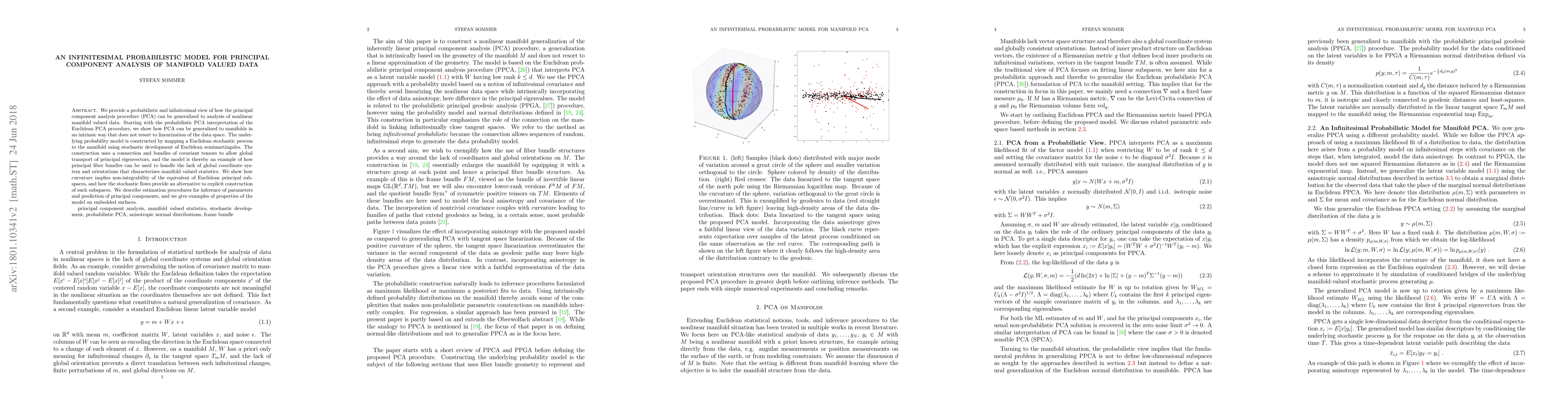 This paper presents a probabilistic model for PCA applicable to nonlinear manifold-valued data, avoiding linearization through intrinsic manifold methods. It uses stochastic development and principal fiber bundles to handle the complexities of manifold statistics, offering an alternative to traditional PCA by leveraging curvature and stochastic flows.