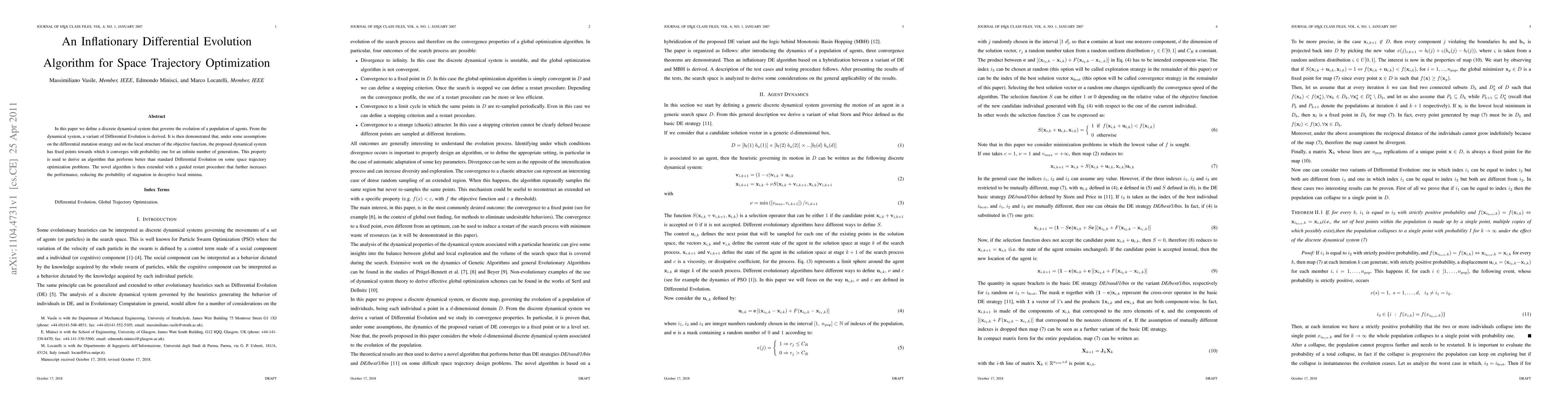 In this paper we define a discrete dynamical system that governs the evolution of a population of agents. From the dynamical system, a variant of Differential Evolution is derived. It is then demonstrated that, under some assumptions on the differential mutation strategy and on the local structure of the objective function, the proposed dynamical system has fixed points towards which it converges with probability one for an infinite number of generations. This property is used to derive an algorithm that performs better than standard Differential Evolution on some space trajectory optimization problems. The novel algorithm is then extended with a guided restart procedure that further increases the performance, reducing the probability of stagnation in deceptive local minima.