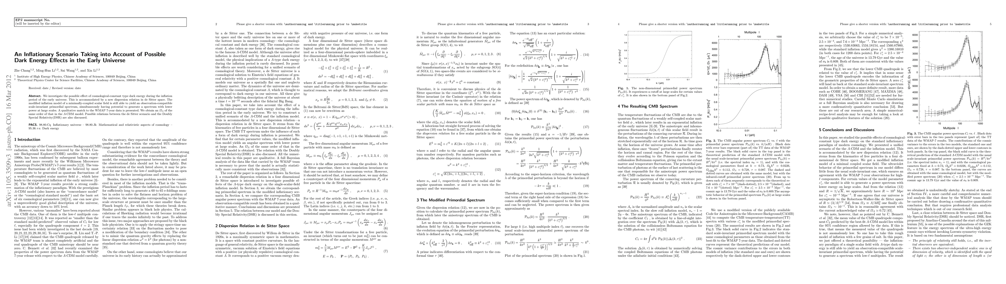 We investigate the possible effect of cosmological-constant type dark energy during the inflation period of the early universe. This is accommodated by a new dispersion relation in de Sitter space. The modified inflation model of a minimally-coupled scalar field is still able to yield an observation-compatible scale-invariant primordial spectrum, simultaneously having potential to generate a spectrum with lower power at large scales. A qualitative match to the WMAP 7-year data is presented. We obtain an $\Omega_\Lambda$ of the same order of that in the $\Lambda$-CDM model. Possible relations between the de Sitter scenario and the Doubly Special Relativity(DSR) are also discussed.