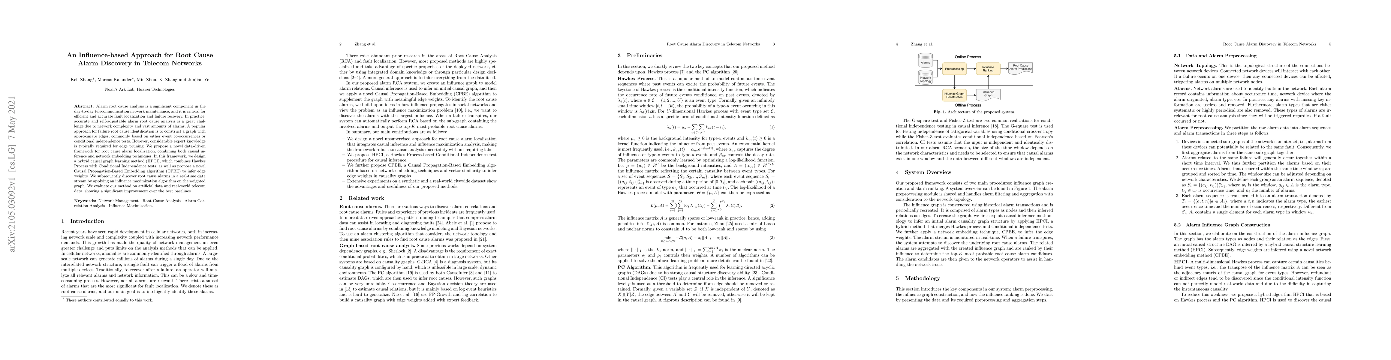 This paper proposes a novel data-driven framework for root cause alarm discovery in telecom networks, combining causal inference and network embedding techniques. The framework utilizes a hybrid causal graph learning method and a Causal Propagation-Based Embedding algorithm to infer edge weights, followed by an influence maximization algorithm for real-time root cause alarm detection.