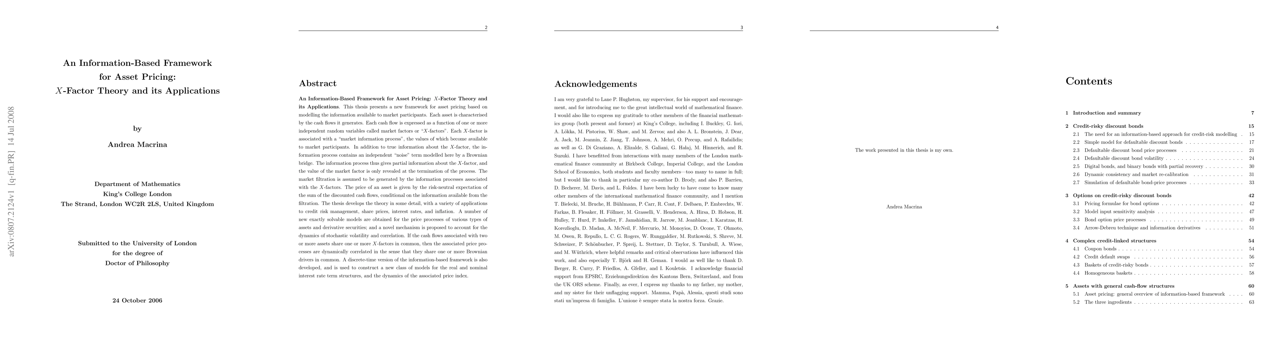 A new framework for asset pricing based on modelling the information available to market participants is presented. Each asset is characterised by the cash flows it generates. Each cash flow is expressed as a function of one or more independent random variables called market factors or "X-factors". Each X-factor is associated with a "market information process", the values of which become available to market participants. In addition to true information about the X-factor, the information process contains an independent "noise" term modelled here by a Brownian bridge. The information process thus gives partial information about the X-factor, and the value of the market factor is only revealed at the termination of the process. The market filtration is assumed to be generated by the information processes associated with the X-factors. The price of an asset is given by the risk-neutral expectation of the sum of the discounted cash flows, conditional on the information available from the filtration. The theory is developed in some detail, with a variety of applications to credit risk management, share prices, interest rates, and inflation. A number of new exactly solvable models are obtained for the price processes of various types of assets and derivative securities; and a novel mechanism is proposed to account for the dynamics of stochastic volatility and dynamic correlation. A discrete-time version of the information-based framework is also developed, and is used to construct a new class of models for the real and nominal interest rate term structures, and the dynamics of the associated price index.