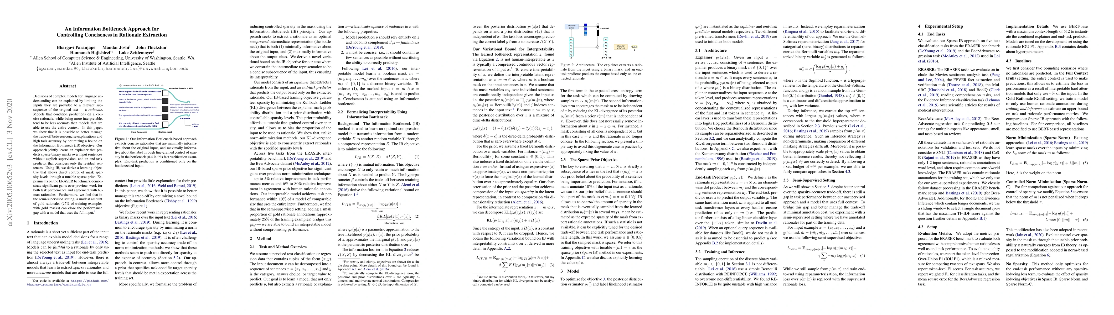 Decisions of complex language understanding models can be rationalized by limiting their inputs to a relevant subsequence of the original text. A rationale should be as concise as possible without significantly degrading task performance, but this balance can be difficult to achieve in practice. In this paper, we show that it is possible to better manage this trade-off by optimizing a bound on the Information Bottleneck (IB) objective. Our fully unsupervised approach jointly learns an explainer that predicts sparse binary masks over sentences, and an end-task predictor that considers only the extracted rationale. Using IB, we derive a learning objective that allows direct control of mask sparsity levels through a tunable sparse prior. Experiments on ERASER benchmark tasks demonstrate significant gains over norm-minimization techniques for both task performance and agreement with human rationales. Furthermore, we find that in the semi-supervised setting, a modest amount of gold rationales (25% of training examples) closes the gap with a model that uses the full input.