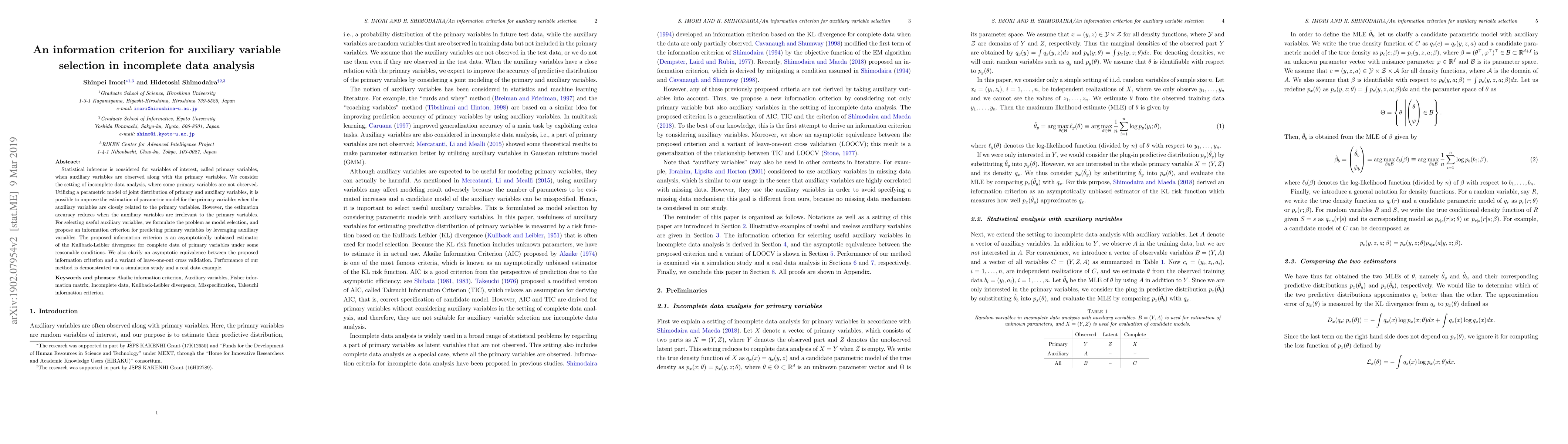 This paper proposes an information criterion for selecting useful auxiliary variables in incomplete data analysis to improve the estimation of primary variables. The criterion is shown to be asymptotically unbiased and equivalent to a variant of leave-one-out cross validation, with performance validated through simulations and real data examples.