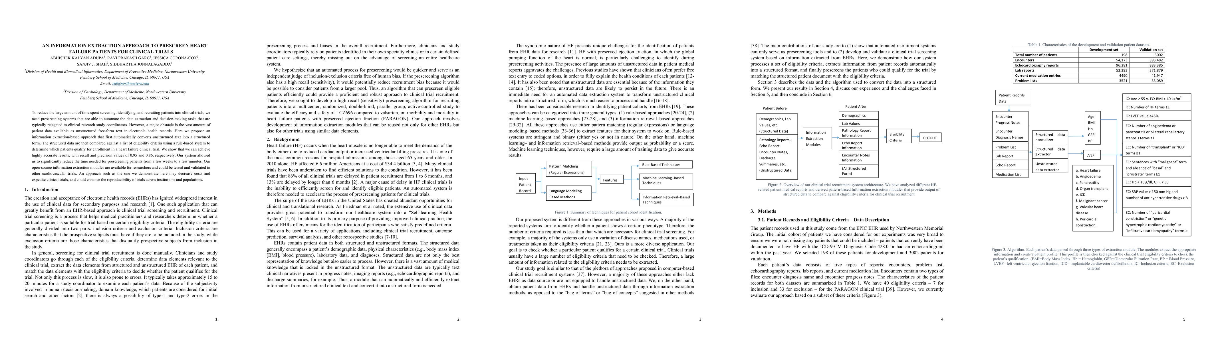 This paper proposes an automated information extraction system to prescreen heart failure patients for clinical trials, converting unstructured text from electronic health records into structured data. The system uses a rule-based method to evaluate patient eligibility, achieving high accuracy and significantly reducing prescreening time from weeks to minutes.
