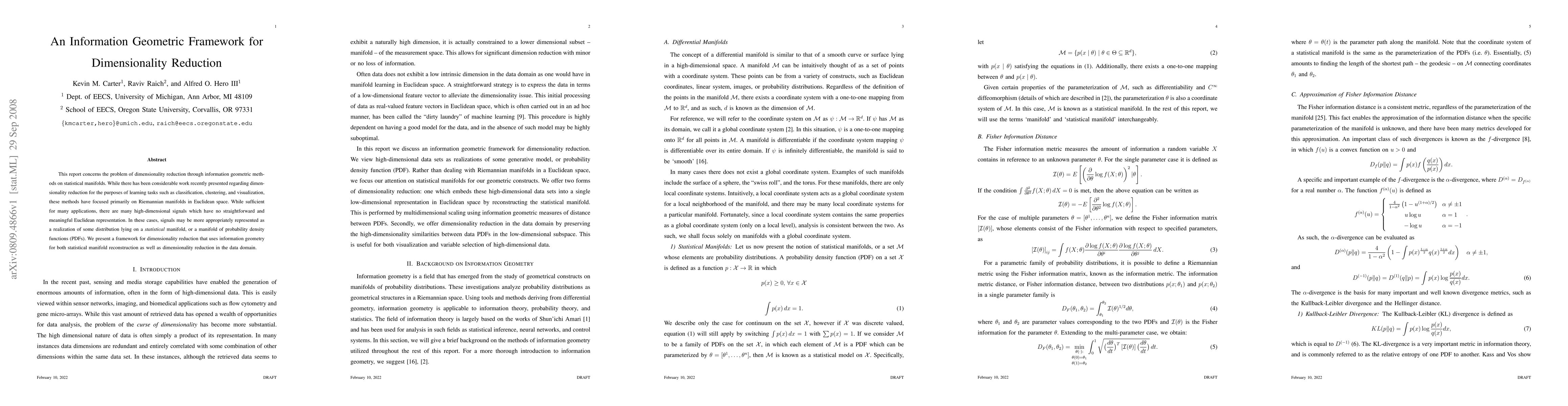 This report concerns the problem of dimensionality reduction through information geometric methods on statistical manifolds. While there has been considerable work recently presented regarding dimensionality reduction for the purposes of learning tasks such as classification, clustering, and visualization, these methods have focused primarily on Riemannian manifolds in Euclidean space. While sufficient for many applications, there are many high-dimensional signals which have no straightforward and meaningful Euclidean representation. In these cases, signals may be more appropriately represented as a realization of some distribution lying on a statistical manifold, or a manifold of probability density functions (PDFs). We present a framework for dimensionality reduction that uses information geometry for both statistical manifold reconstruction as well as dimensionality reduction in the data domain.