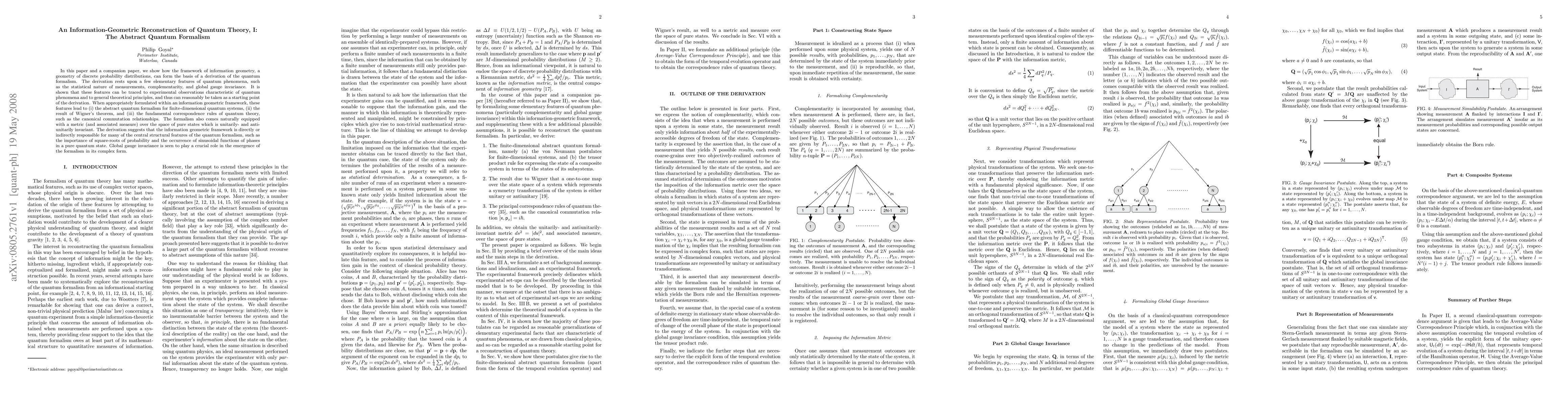 In this paper and a companion paper, we show how the framework of information geometry, a geometry of discrete probability distributions, can form the basis of a derivation of the quantum formalism. The derivation rests upon a few elementary features of quantum phenomena, such as the statistical nature of measurements, complementarity, and global gauge invariance. It is shown that these features can be traced to experimental observations characteristic of quantum phenomena and to general theoretical principles, and thus can reasonably be taken as a starting point of the derivation. When appropriately formulated within an information geometric framework, these features lead to (i) the abstract quantum formalism for finite-dimensional quantum systems, (ii) the result of Wigner's theorem, and (iii) the fundamental correspondence rules of quantum theory, such as the canonical commutation relationships. The formalism also comes naturally equipped with a metric (and associated measure) over the space of pure states which is unitarily- and anti-unitarily invariant. The derivation suggests that the information geometric framework is directly or indirectly responsible for many of the central structural features of the quantum formalism, such as the importance of square-roots of probability and the occurrence of sinusoidal functions of phases in a pure quantum state. Global gauge invariance is seen to play a crucial role in the emergence of the formalism in its complex form.