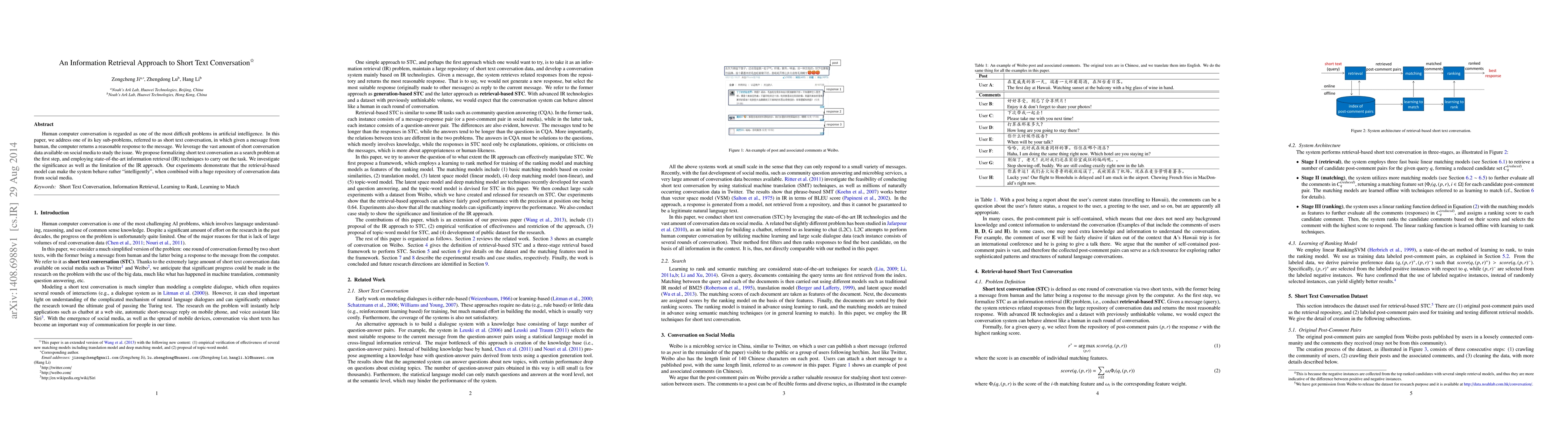 This paper proposes treating short text conversation as an information retrieval problem, utilizing social media data to develop a system that responds intelligently to human messages. The study explores the effectiveness of using advanced IR techniques, highlighting both the benefits and limitations of this approach.