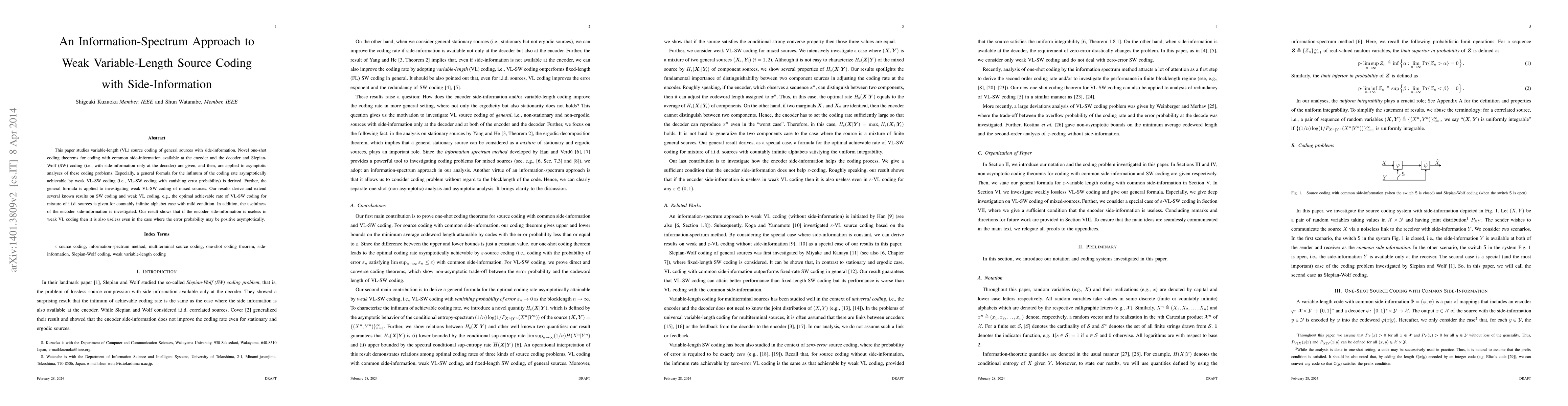 This paper studies variable-length (VL) source coding of general sources with side-information. Novel one-shot coding theorems for coding with common side-information available at the encoder and the decoder and Slepian- Wolf (SW) coding (i.e., with side-information only at the decoder) are given, and then, are applied to asymptotic analyses of these coding problems. Especially, a general formula for the infimum of the coding rate asymptotically achievable by weak VL-SW coding (i.e., VL-SW coding with vanishing error probability) is derived. Further, the general formula is applied to investigating weak VL-SW coding of mixed sources. Our results derive and extend several known results on SW coding and weak VL coding, e.g., the optimal achievable rate of VL-SW coding for mixture of i.i.d. sources is given for countably infinite alphabet case with mild condition. In addition, the usefulness of the encoder side-information is investigated. Our result shows that if the encoder side-information is useless in weak VL coding then it is also useless even in the case where the error probability may be positive asymptotically.