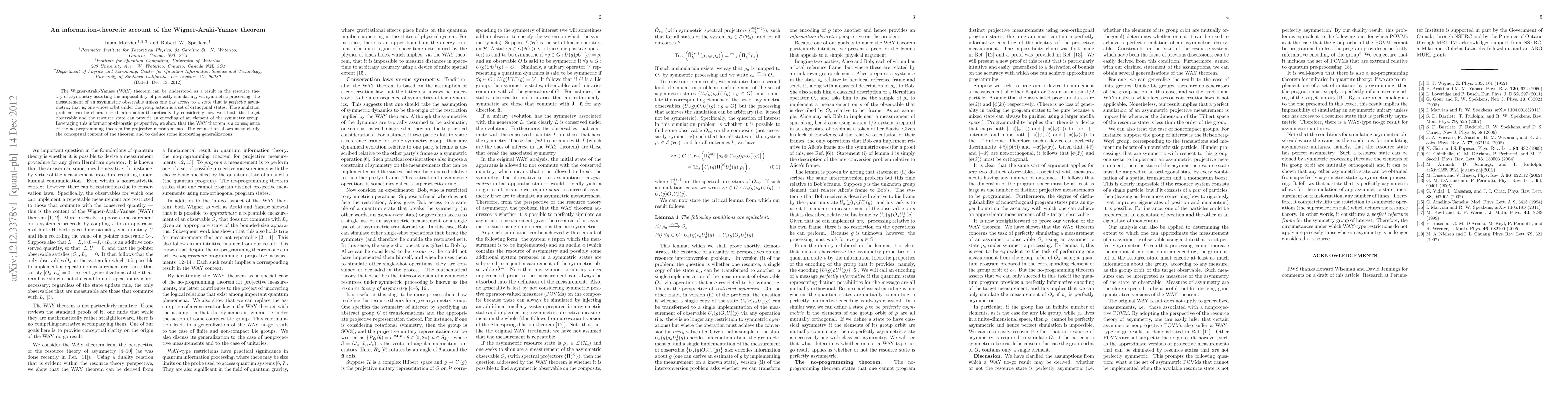 The Wigner-Araki-Yanase (WAY) theorem can be understood as a result in the resource theory of asymmetry asserting the impossibility of perfectly simulating, via symmetric processing, the measurement of an asymmetric observable unless one has access to a state that is perfectly asymmetric, that is, one whose orbit under the group action is a set of orthogonal states. The simulation problem can be characterized information-theoretically by considering how well both the target observable and the resource state can provide an encoding of an element of the symmetry group. Leveraging this information-theoretic perspective, we show that the WAY theorem is a consequence of the no-programming theorem for projective measurements. The connection allows us to clarify the conceptual content of the theorem and to deduce some interesting generalizations.