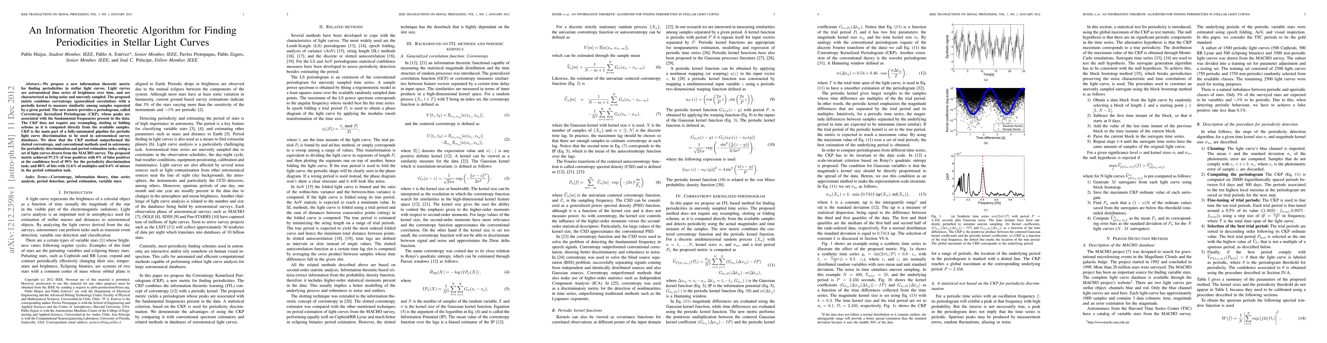 This paper proposes an information theoretic metric combining correntropy and a periodic kernel to detect periodicities in noisy, unevenly sampled stellar light curves. The Correntropy Kernelized Periodogram (CKP) method outperforms conventional techniques, achieving high accuracy in periodicity discrimination and period estimation.