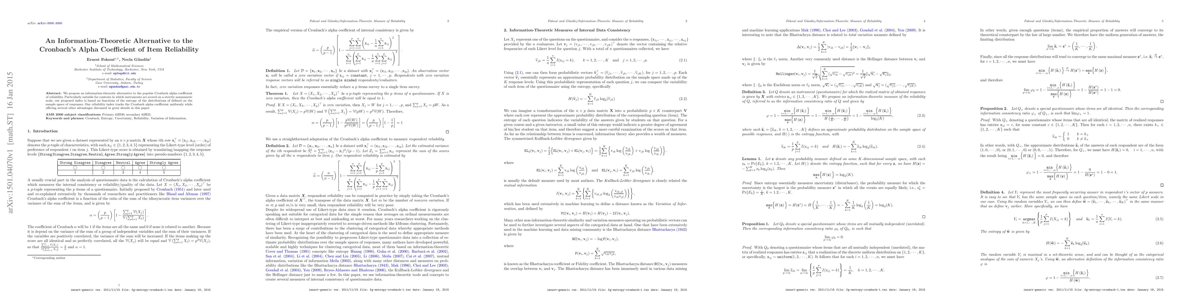 We propose an information-theoretic alternative to the popular Cronbach alpha coefficient of reliability. Particularly suitable for contexts in which instruments are scored on a strictly nonnumeric scale, our proposed index is based on functions of the entropy of the distributions of defined on the sample space of responses. Our reliability index tracks the Cronbach alpha coefficient uniformly while offering several other advantages discussed in great details in this paper.