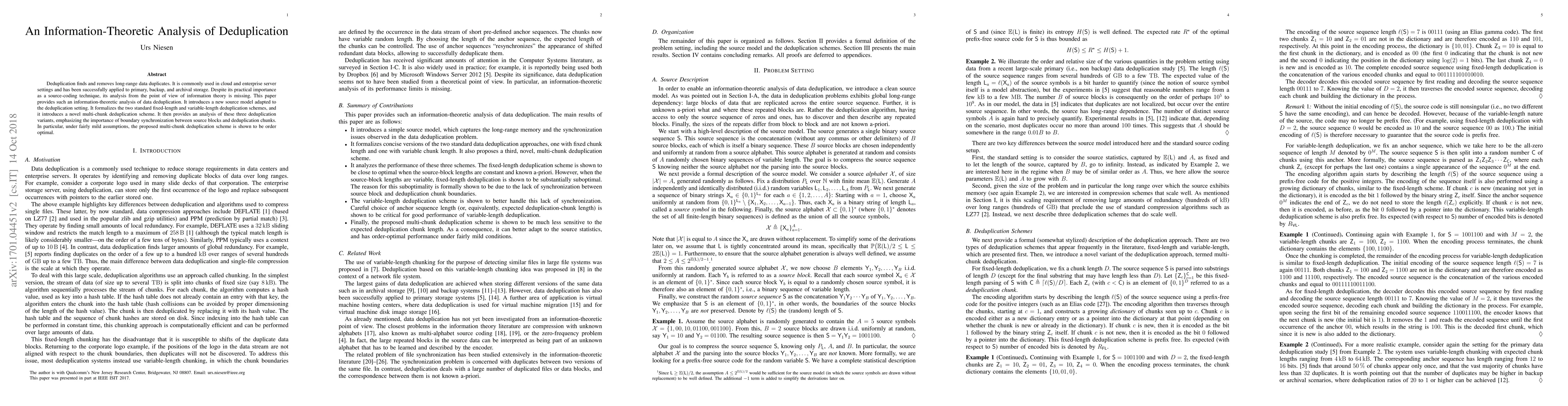 Deduplication finds and removes long-range data duplicates. It is commonly used in cloud and enterprise server settings and has been successfully applied to primary, backup, and archival storage. Despite its practical importance as a source-coding technique, its analysis from the point of view of information theory is missing. This paper provides such an information-theoretic analysis of data deduplication. It introduces a new source model adapted to the deduplication setting. It formalizes the two standard fixed-length and variable-length deduplication schemes, and it introduces a novel multi-chunk deduplication scheme. It then provides an analysis of these three deduplication variants, emphasizing the importance of boundary synchronization between source blocks and deduplication chunks. In particular, under fairly mild assumptions, the proposed multi-chunk deduplication scheme is shown to be order optimal.