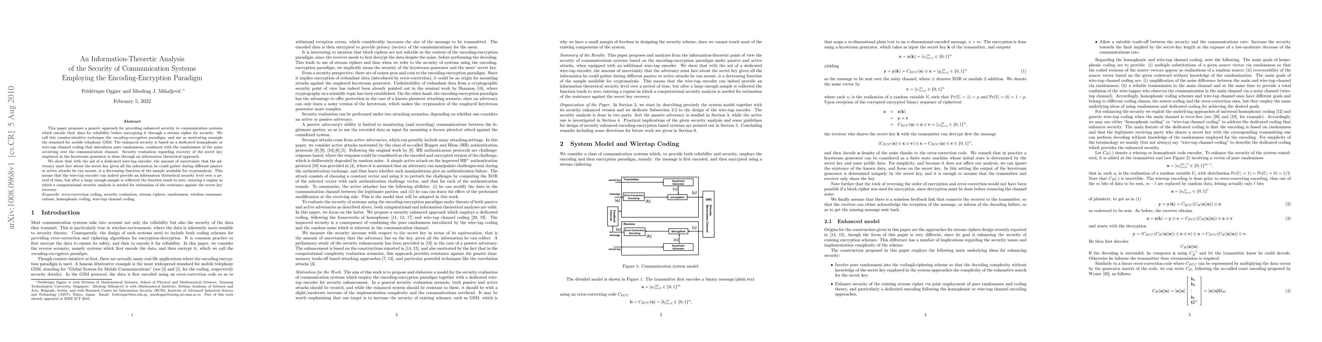 This paper proposes a generic approach to enhance security in communication systems using an encoding-encryption paradigm, which combines channel coding with stream cipher encryption. It shows that the wire-tap encoder can provide information-theoretic security over time, but eventually falls into a regime requiring computational analysis for secret key recovery estimation.