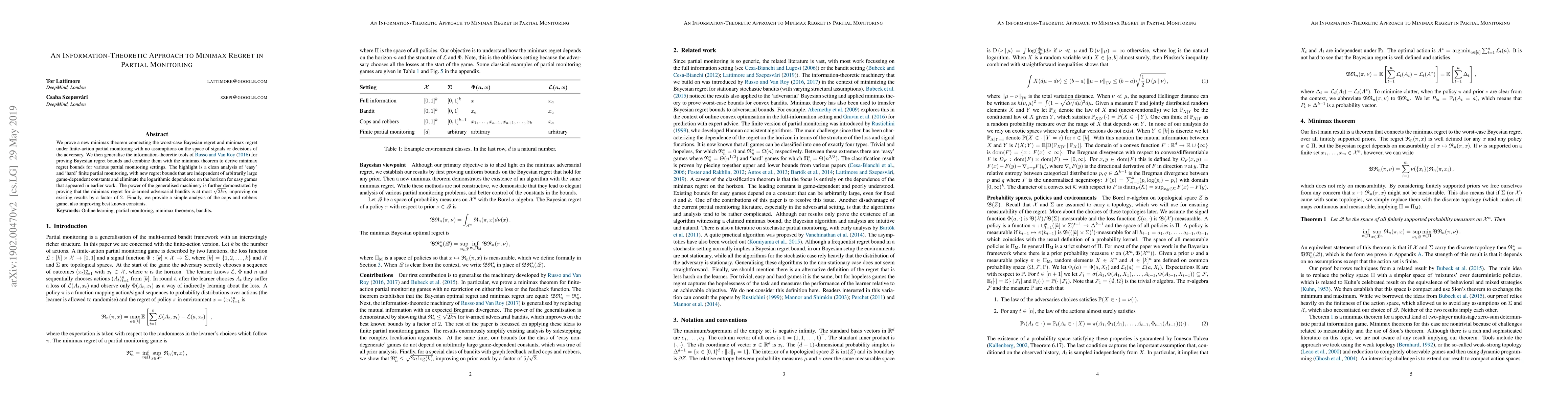 This paper establishes a new minimax theorem linking worst-case Bayesian regret and minimax regret under partial monitoring, generalising existing information-theoretic tools. It introduces improved regret bounds for partial monitoring scenarios, notably enhancing results for k-armed adversarial bandits and the cops and robbers game.