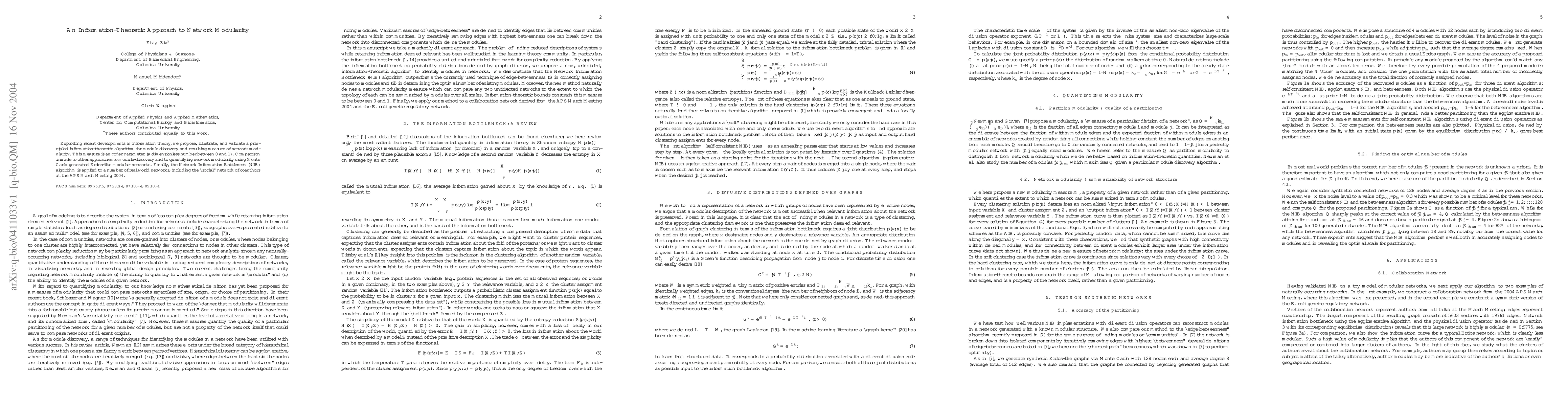 Exploiting recent developments in information theory, we propose, illustrate, and validate a principled information-theoretic algorithm for module discovery and resulting measure of network modularity. This measure is an order parameter (a dimensionless number between 0 and 1). Comparison is made to other approaches to module-discovery and to quantifying network modularity using Monte Carlo generated Erdos-like modular networks. Finally, the Network Information Bottleneck (NIB) algorithm is applied to a number of real world networks, including the "social" network of coauthors at the APS March Meeting 2004.
