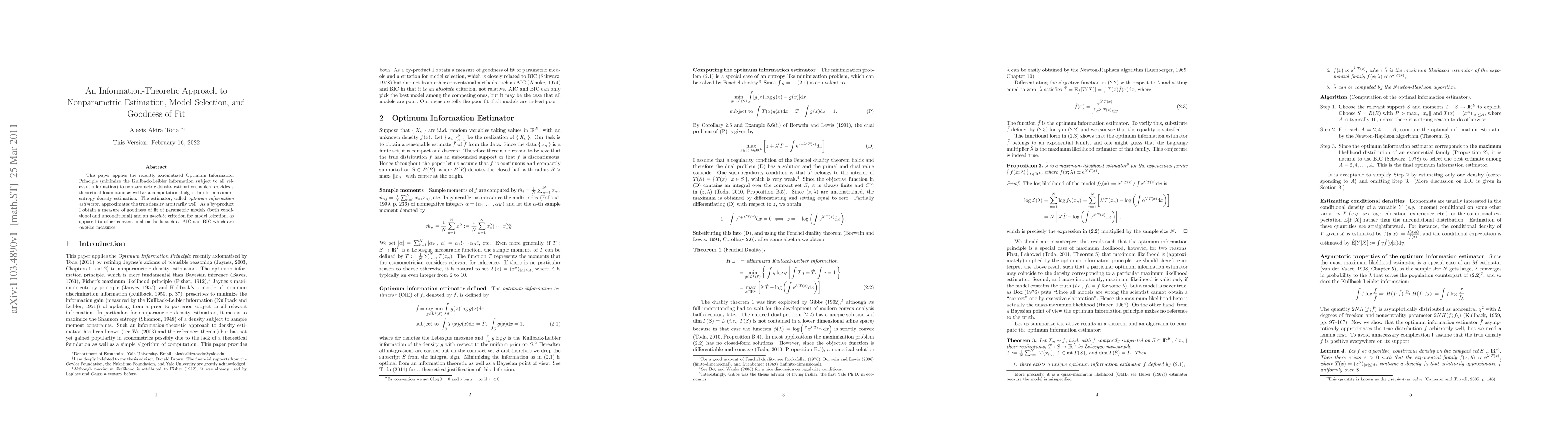 This paper applies the Optimum Information Principle to nonparametric density estimation, providing a theoretical foundation and computational algorithm for maximum entropy density estimation, as well as an absolute criterion for model selection.