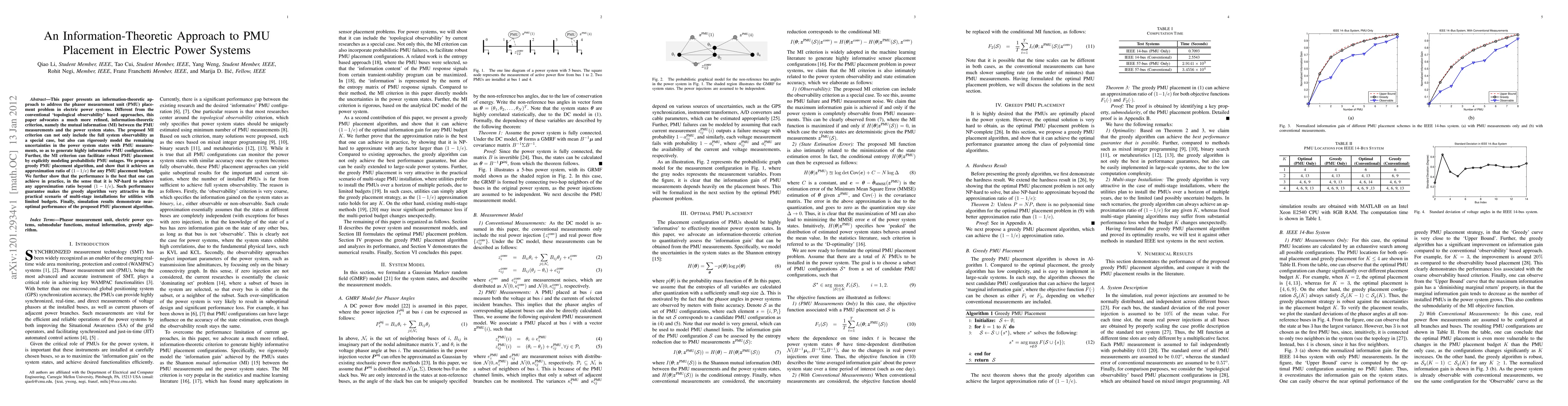 This paper proposes an information-theoretic approach using mutual information for phasor measurement unit (PMU) placement in electric power systems, achieving near-optimal configurations and robust placement even with PMU outages. The greedy algorithm offers an approximation ratio of (1-1/e) and is shown to be practically optimal.
