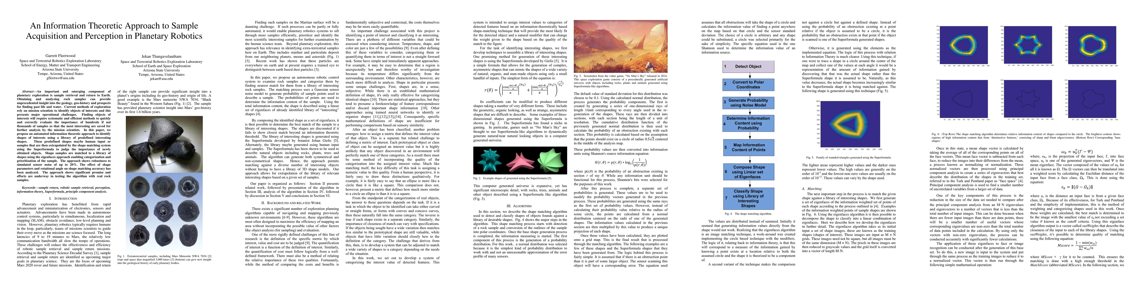 This paper proposes an automated information theoretic method for identifying interesting shapes in planetary sample retrieval using predefined shape libraries and the Superformula. The eigenfaces approach enables categorization and prioritization of samples, demonstrating robustness against sensor noise and promising results in initial tests with real rock samples.