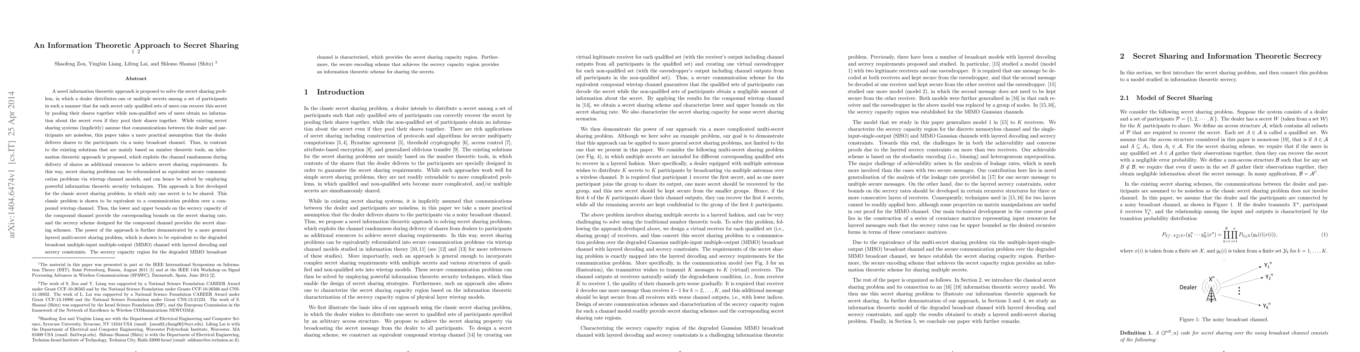 A novel information theoretic approach is proposed to solve the secret sharing problem, in which a dealer distributes one or multiple secrets among a set of participants that for each secret only qualified sets of users can recover it by pooling their shares together while non-qualified sets of users obtain no information about the secret even if they pool their shares together. While existing secret sharing systems (implicitly) assume that communications between the dealer and participants are noiseless, this paper takes a more practical assumption that the dealer delivers shares to the participants via a noisy broadcast channel. An information theoretic approach is proposed, which exploits the channel as additional resources to achieve secret sharing requirements. In this way, secret sharing problems can be reformulated as equivalent secure communication problems via wiretap channels, and can be solved by employing powerful information theoretic security techniques. This approach is first developed for the classic secret sharing problem, in which only one secret is to be shared. This classic problem is shown to be equivalent to a communication problem over a compound wiretap channel. The lower and upper bounds on the secrecy capacity of the compound channel provide the corresponding bounds on the secret sharing rate. The power of the approach is further demonstrated by a more general layered multi-secret sharing problem, which is shown to be equivalent to the degraded broadcast multiple-input multiple-output (MIMO) channel with layered decoding and secrecy constraints. The secrecy capacity region for the degraded MIMO broadcast channel is characterized, which provides the secret sharing capacity region. Furthermore, these secure encoding schemes that achieve the secrecy capacity region provide an information theoretic scheme for sharing the secrets.