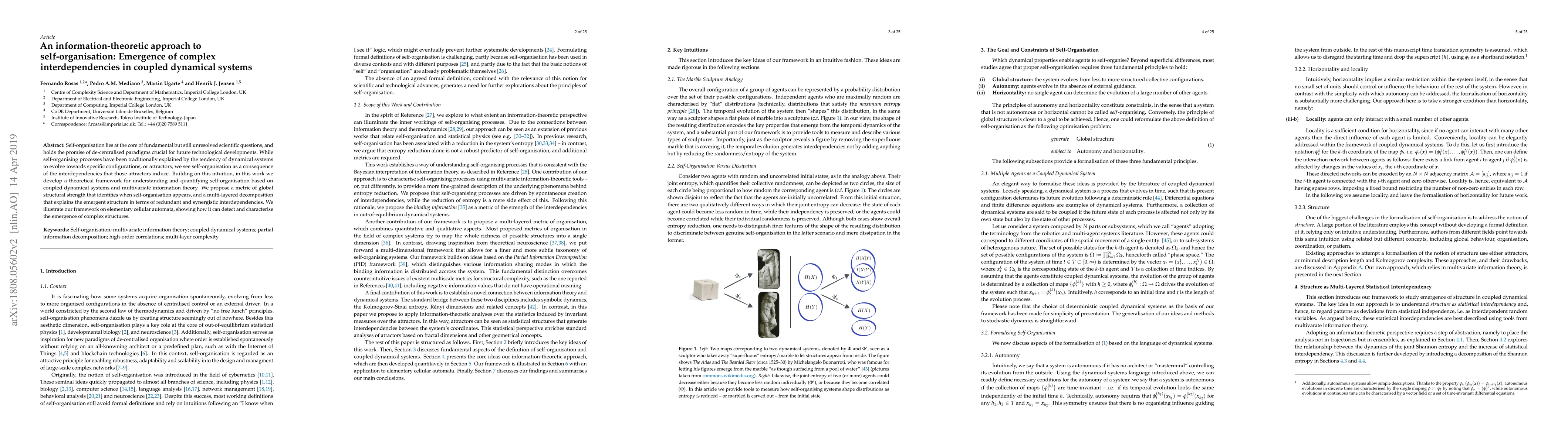 This paper develops a theoretical framework using information theory to understand self-organisation in coupled dynamical systems, proposing a metric for global structural strength and a decomposition method to identify redundant and synergistic interdependencies. The framework is demonstrated on elementary cellular automata to illustrate its ability to detect complex emergent structures.