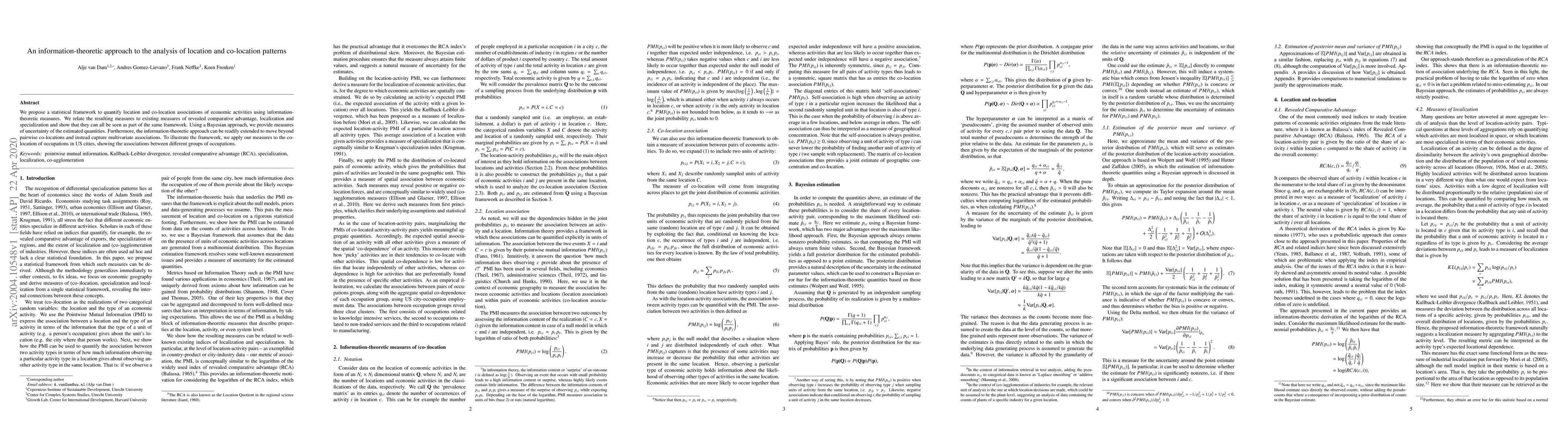 This paper proposes an information-theoretic framework to quantify location and co-location associations of economic activities, relating these measures to existing economic indicators. It demonstrates the framework's application to US cities to reveal occupational associations, incorporating uncertainty measures via a Bayesian approach.
