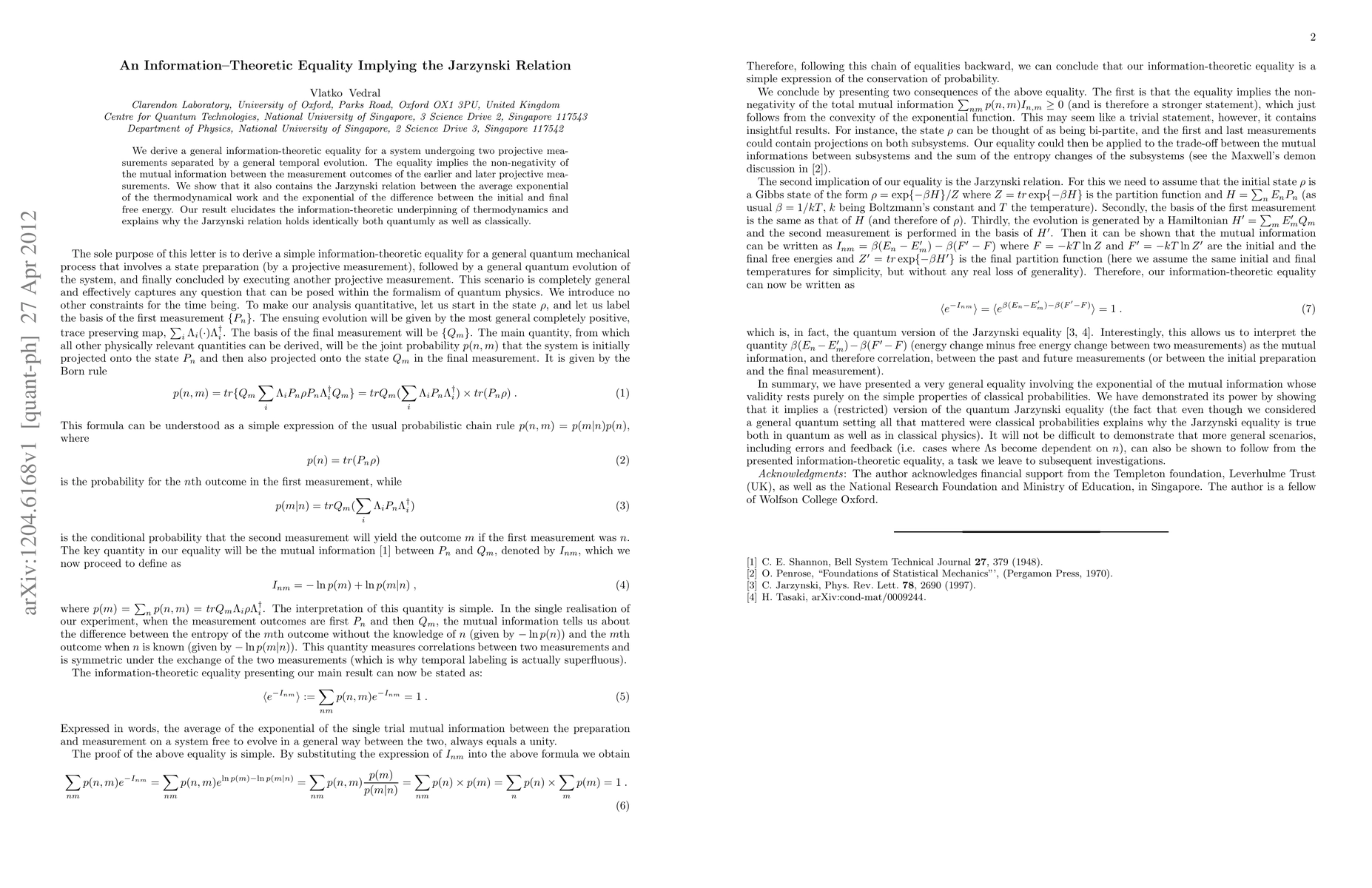 We derive a general information-theoretic equality for a system undergoing two projective measurements separated by a general temporal evolution. The equality implies the non-negativity of the mutual information between the measurement outcomes of the earlier and later projective measurements. We show that it also contains the Jarzynski relation between the average exponential of the thermodynamical work and the exponential of the difference between the initial and final free energy. Our result elucidates the information-theoretic underpinning of thermodynamics and explains why the Jarzynski relation holds identically both quantumly as well as classically.