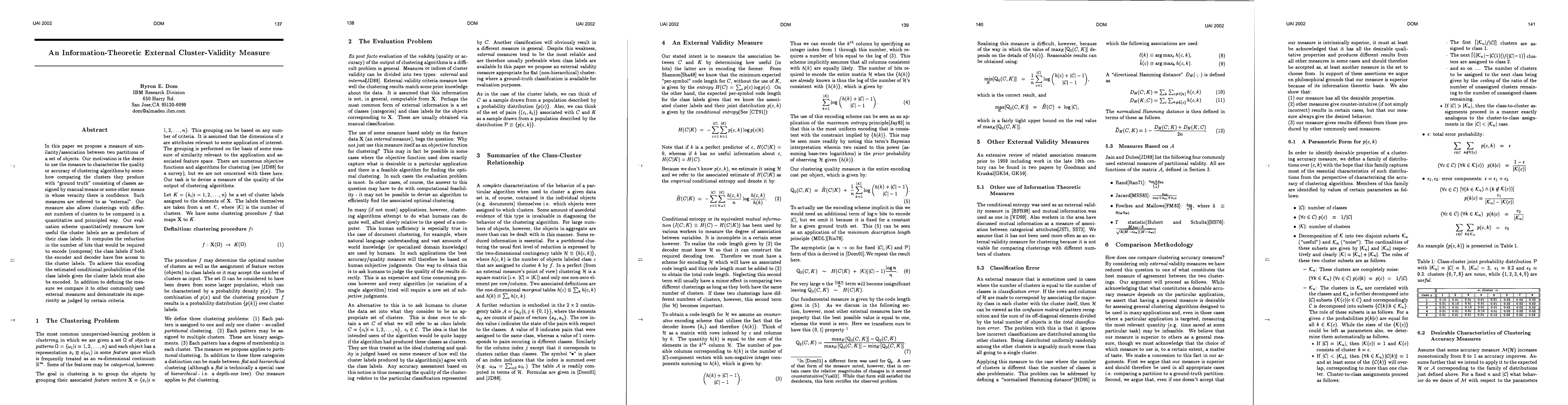 This paper introduces an information-theoretic external cluster-validity measure that compares clustering results with ground truth class labels. It evaluates clustering quality by measuring how well cluster labels predict class labels, allowing for comparisons across clusterings with different numbers of clusters.