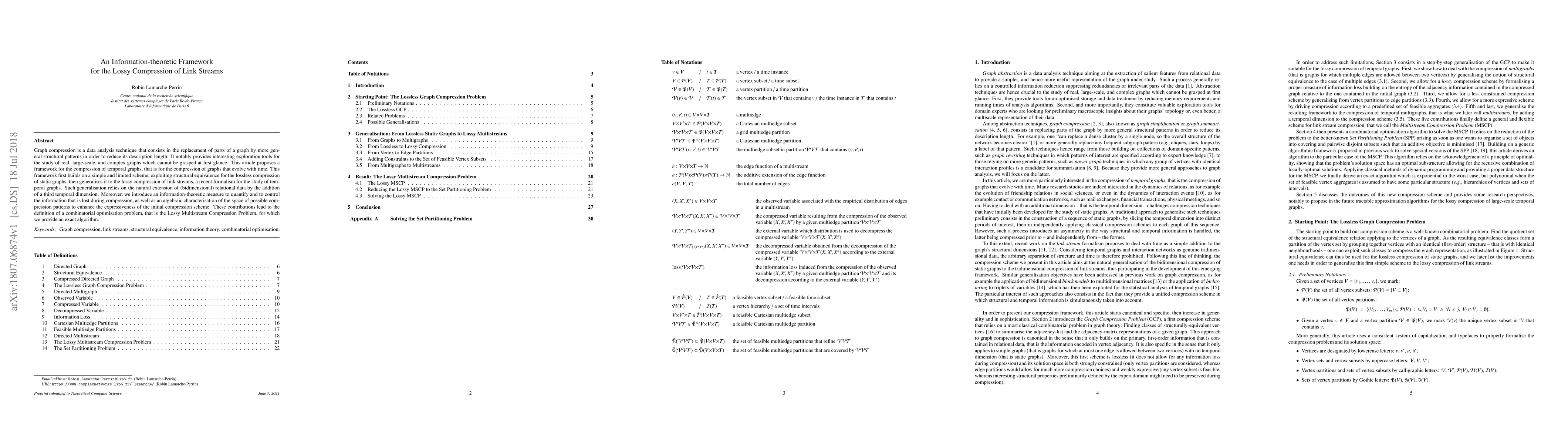 This paper proposes an information-theoretic framework for compressing evolving temporal graphs, introducing a lossy compression method for link streams and an information-theoretic measure to quantify compression-induced loss, alongside an exact algorithm for the Lossy Multistream Compression Problem.