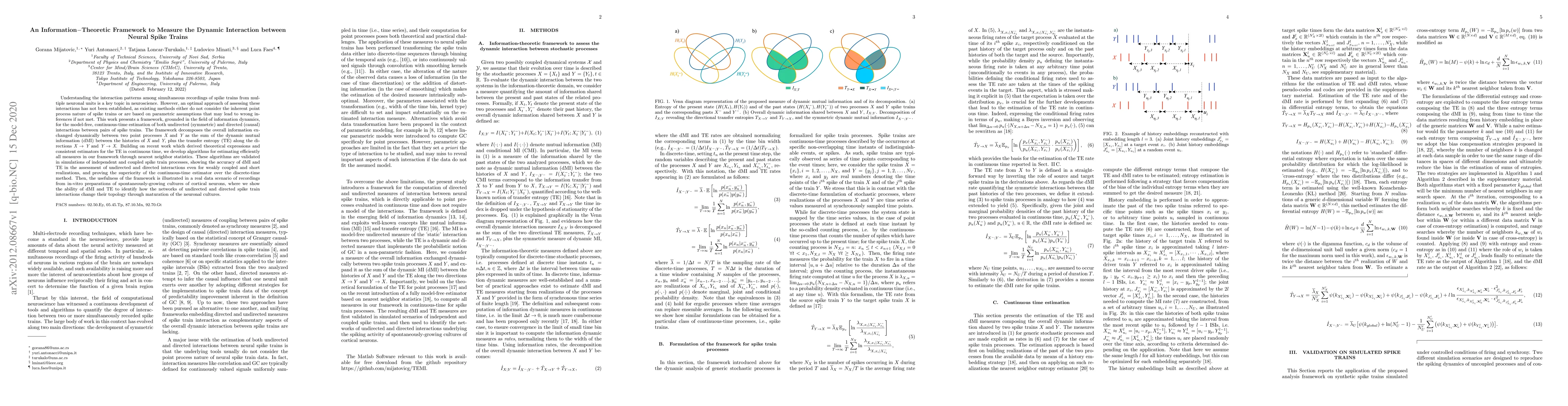 This paper introduces an information-theoretic framework for model-free, continuous-time estimation of both undirected and directed interactions between neural spike trains, decomposing the dynamic information exchange into dynamic mutual information and transfer entropy. The proposed algorithms are validated through simulations and applied to real in-vitro cortical neuron data, demonstrating the framework's effectiveness in identifying changes in network interaction topology.