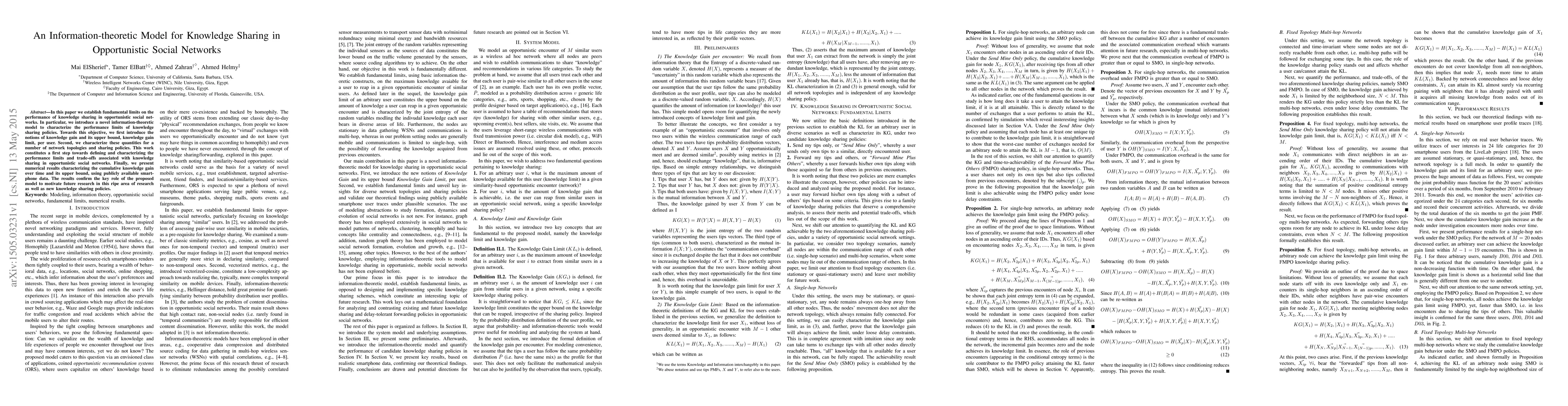 This paper introduces an information-theoretic model to define and characterize the performance limits of knowledge sharing in opportunistic social networks, analyzing knowledge gain and its upper bound for various network topologies and sharing policies. Numerical results using smartphone data validate the model's effectiveness in guiding future research and policy development.