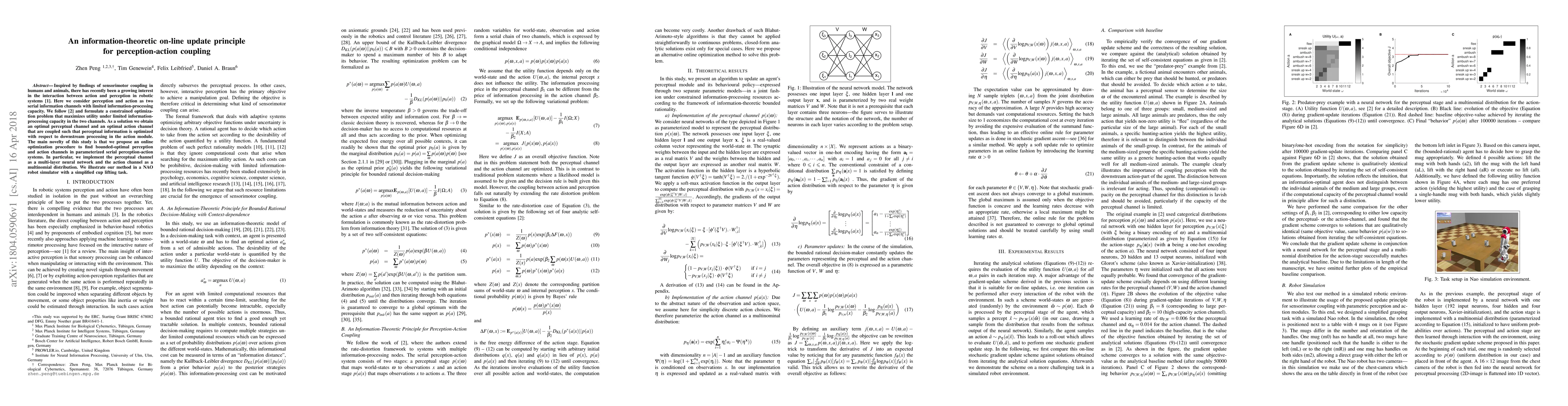 Inspired by findings of sensorimotor coupling in humans and animals, there has recently been a growing interest in the interaction between action and perception in robotic systems [Bogh et al., 2016]. Here we consider perception and action as two serial information channels with limited information-processing capacity. We follow [Genewein et al., 2015] and formulate a constrained optimization problem that maximizes utility under limited information-processing capacity in the two channels. As a solution we obtain an optimal perceptual channel and an optimal action channel that are coupled such that perceptual information is optimized with respect to downstream processing in the action module. The main novelty of this study is that we propose an online optimization procedure to find bounded-optimal perception and action channels in parameterized serial perception-action systems. In particular, we implement the perceptual channel as a multi-layer neural network and the action channel as a multinomial distribution. We illustrate our method in a NAO robot simulator with a simplified cup lifting task.