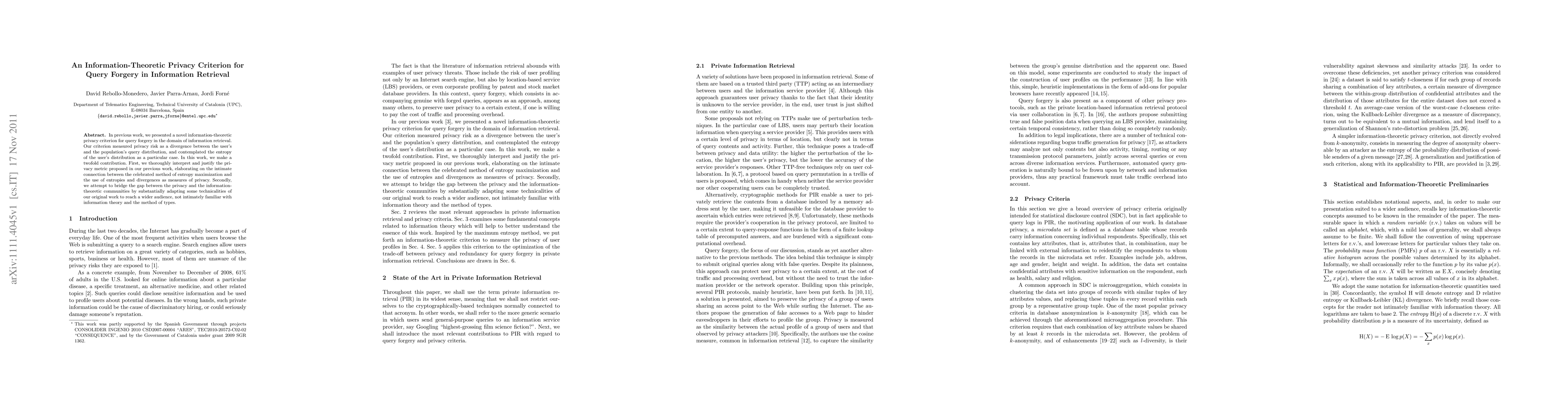 Researchers developed a new information-theoretic method to measure query forgery privacy in information retrieval, bridging the gap between privacy and information theory for a wider audience.